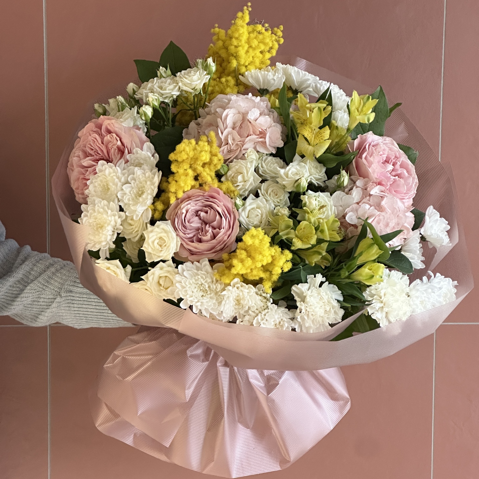 Состав: хризантема кустовая 4, роза 3, альстромерия 3, роза кустовая 3, гвоздика 2, гортензия 2, салал 0,5 и прочее. под заказ