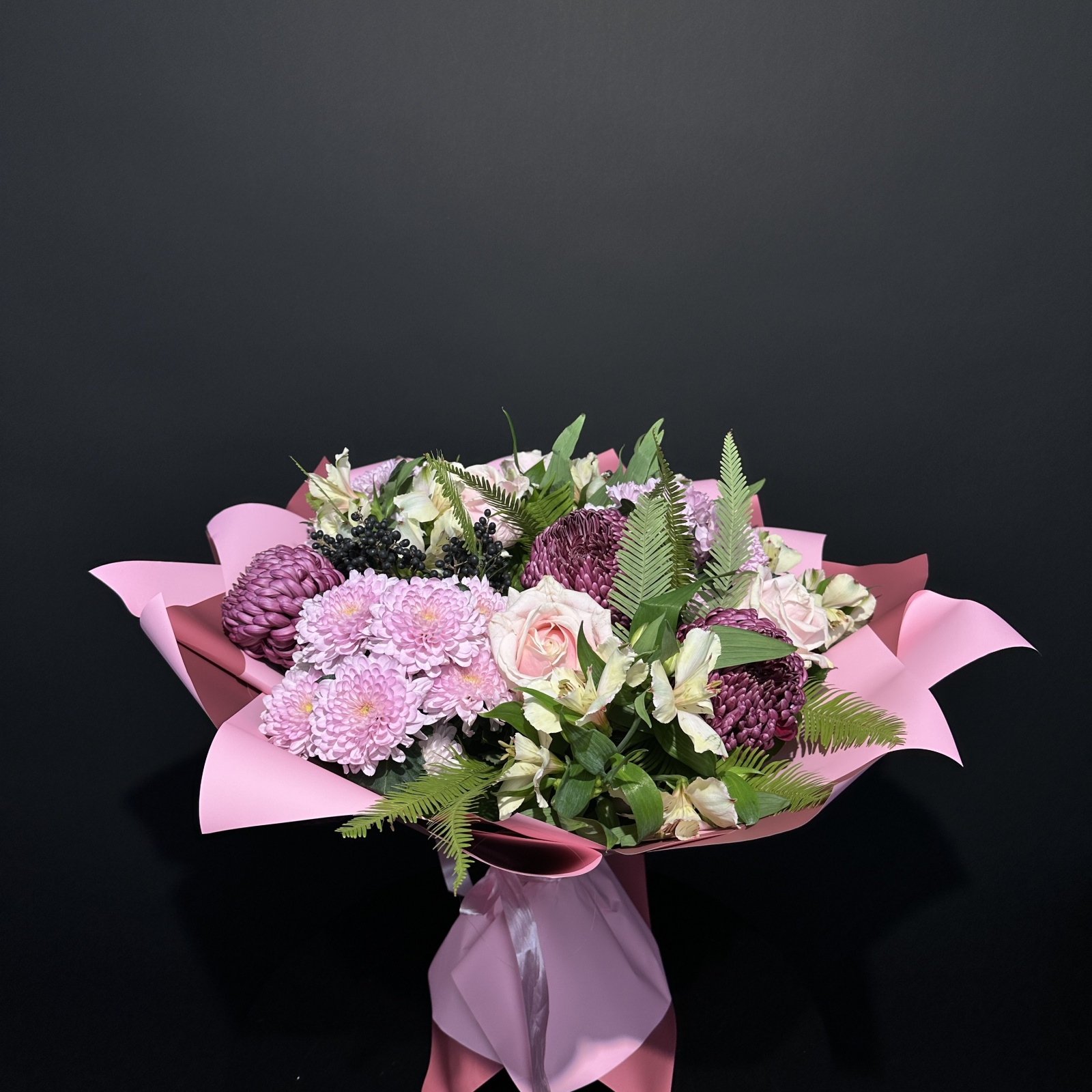 Состав: роза 6, альстромерия 4, хризантема кустовая 3, хризантема 3, рускус 0,5 и прочее. в наличии