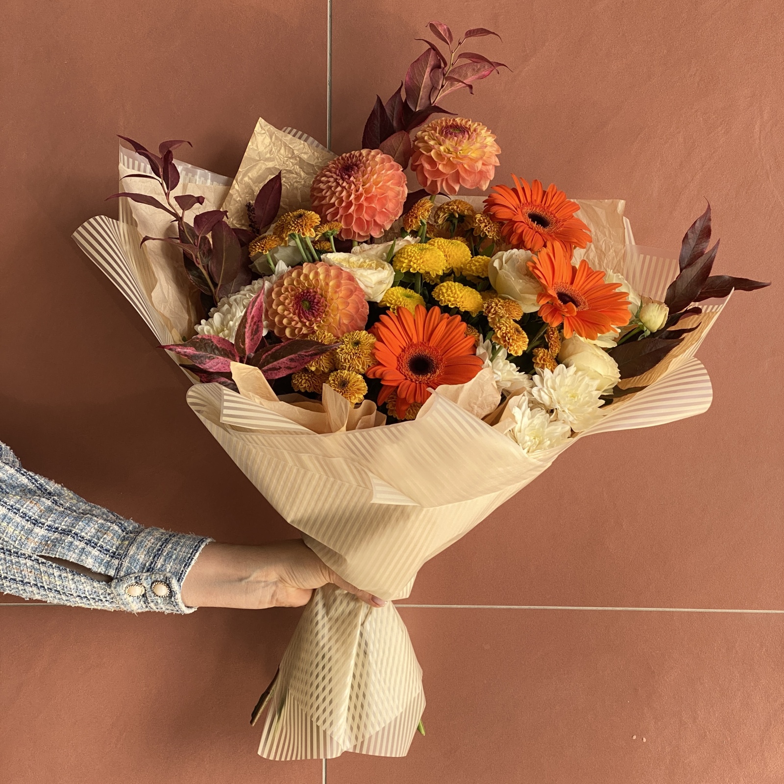 Состав: хризантема 4, хризантема кустовая 3, гербера 3, роза кустовая 2, фисташка 0,3 и прочее. под заказ