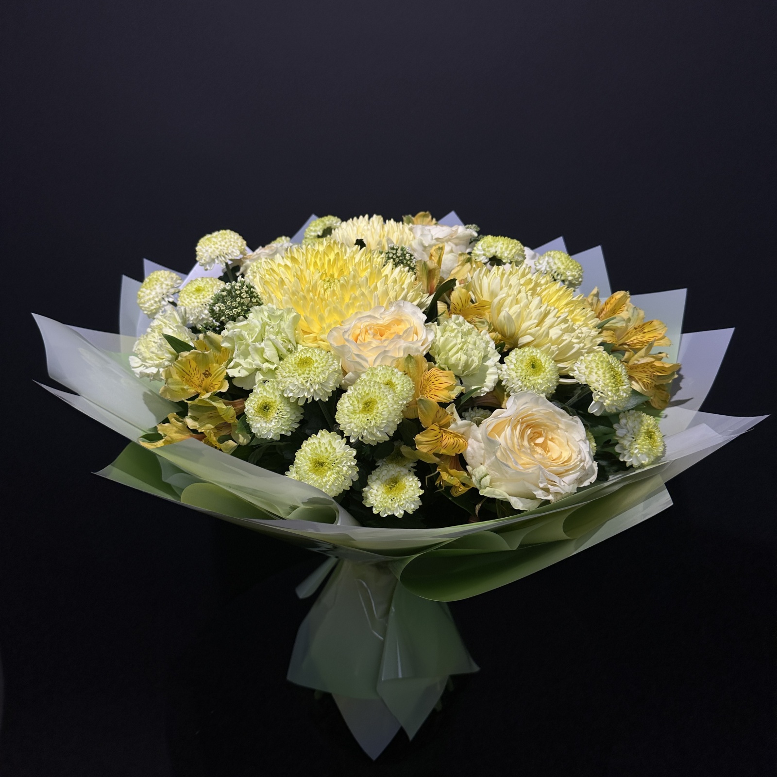 Состав: роза 6, альстромерия 5, хризантема кустовая 5, гвоздика 3, хризантема 3, рускус 1 и прочее. в наличии