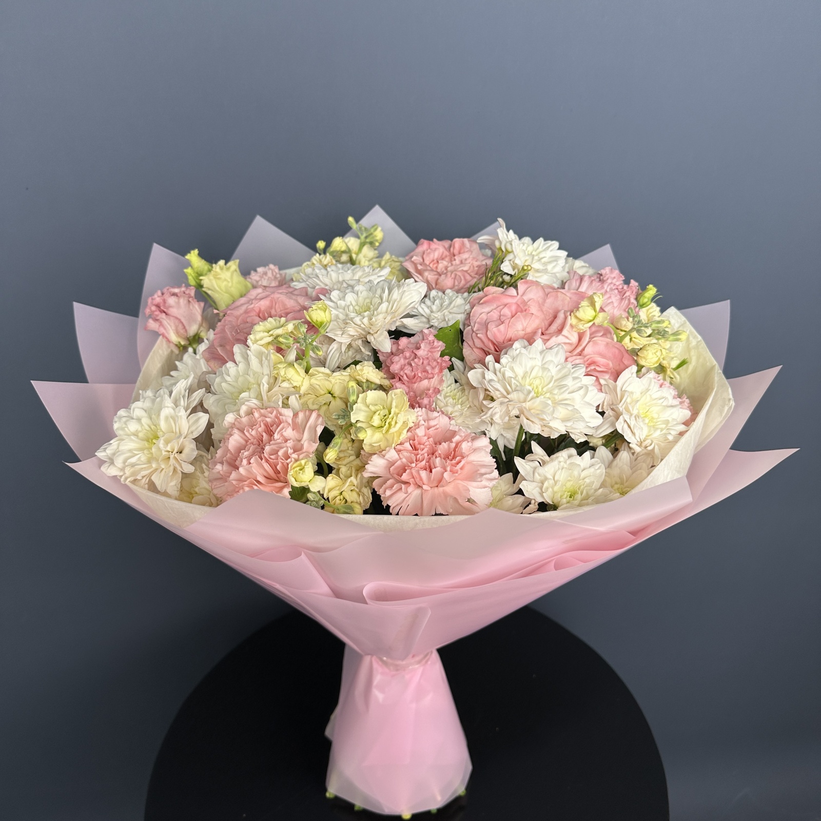 Состав: гвоздика 4, хризантема кустовая 4, лизиантус 3, маттиола 3, роза 3 и прочее.