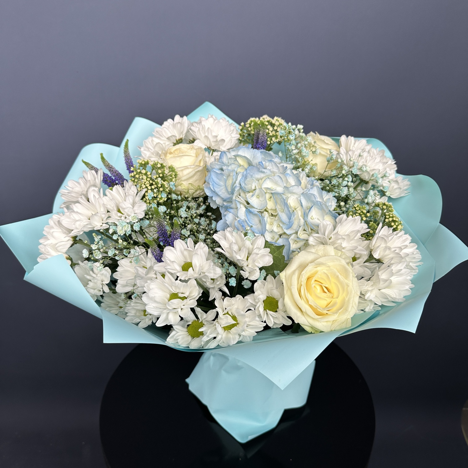 Состав: хризантема кустовая 6, роза 3, альстромерия 3, гортензия 1 и прочее.