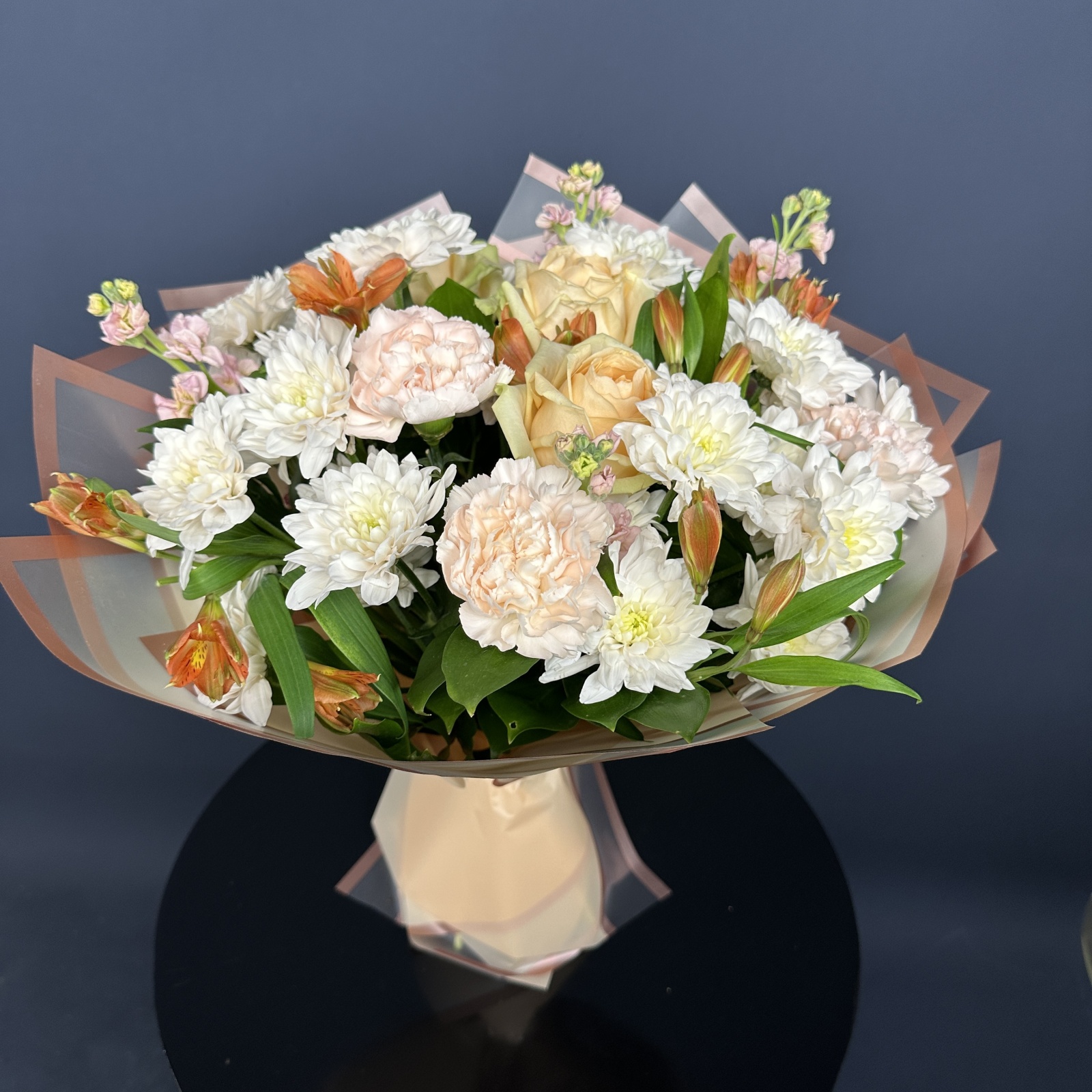 Состав: альстромерия 5, хризантема кустовая 5, маттиола 4, роза 3, гвоздика 3, рускус 0,5 и прочее.