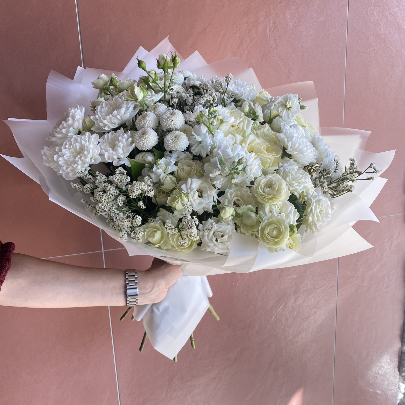 Состав: хризантема кустовая 5, роза 5, роза кустовая 3, лимониум 3, маттиола 2, рускус 1 и прочее. под заказ
