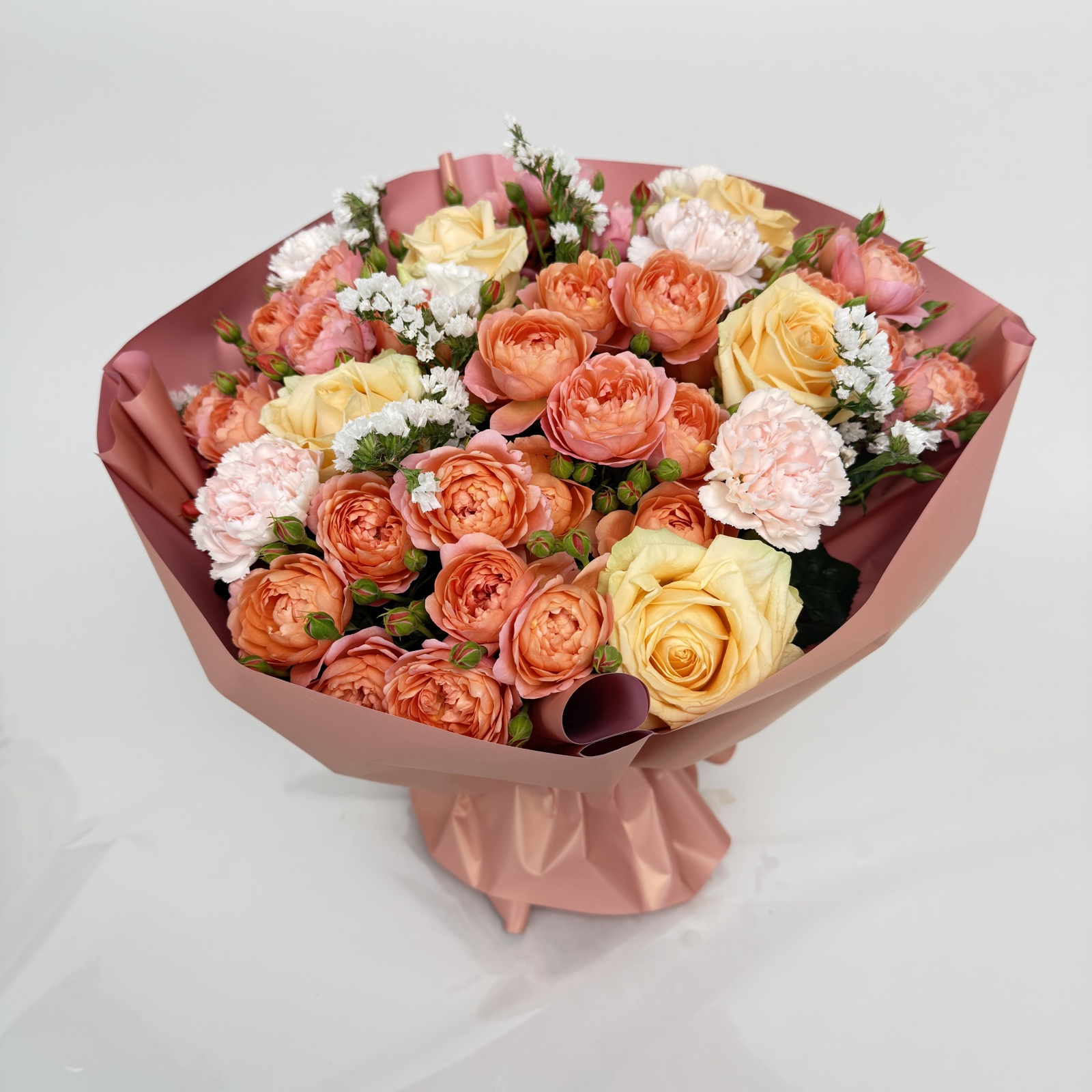 Состав: роза 5, гвоздика 5, роза кустовая 5, хризантема кустовая 2, рускус 0,5 и прочее. под заказ