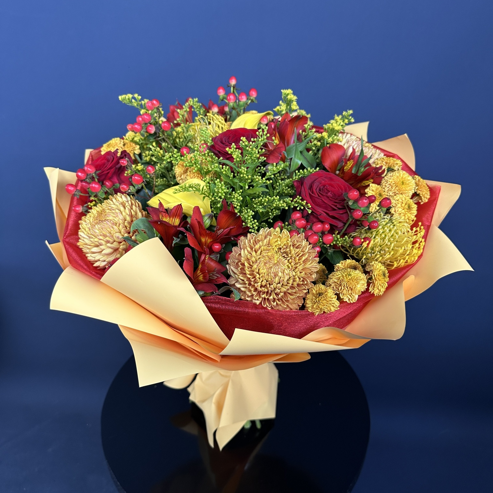 Состав: хризантема 7, роза 7, альстромерия 3, гиперикум 3, солидаго 3, лизимахия 2 и прочее.