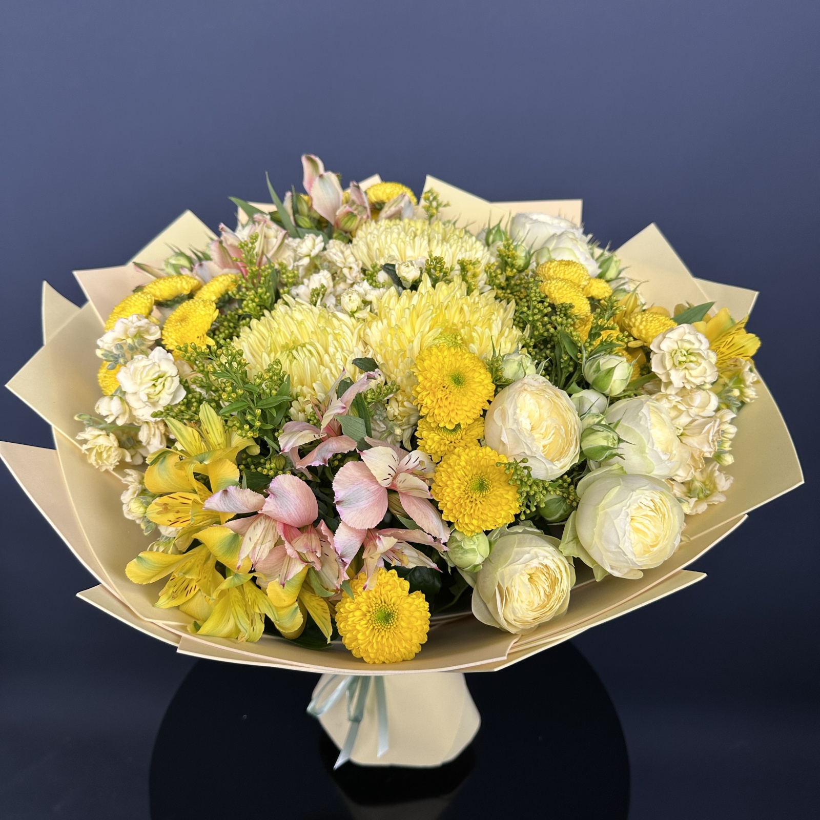Состав: альстромерия 5, хризантема кустовая 4, маттиола 4, солидаго 4, роза кустовая 3, хризантема 3 и прочее.