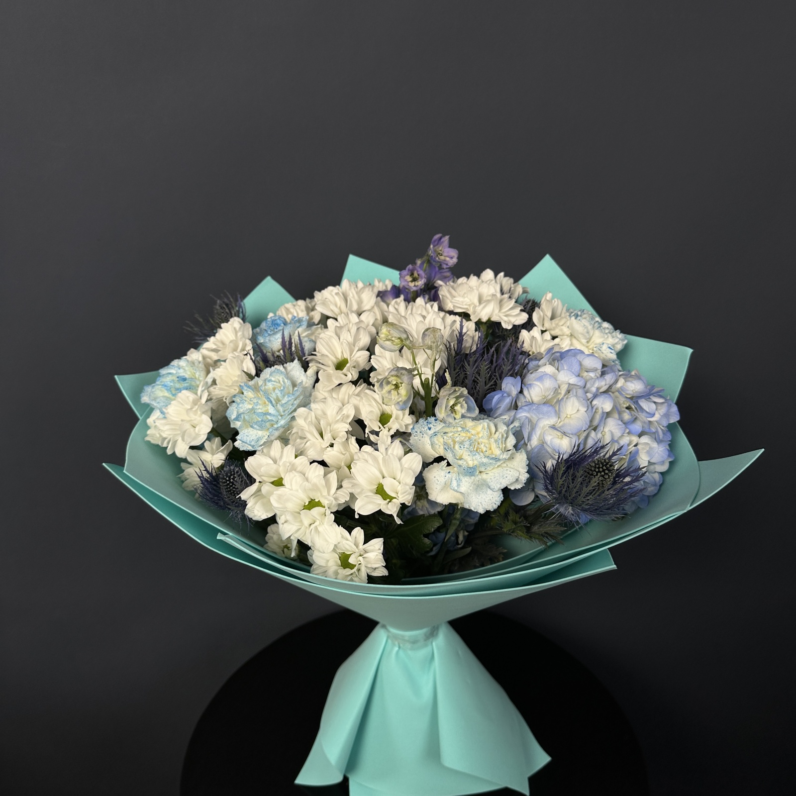 Состав: гвоздика 6, хризантема кустовая 5, дельфиниум 5, эрингиум 2, гортензия 1 и прочее. под заказ