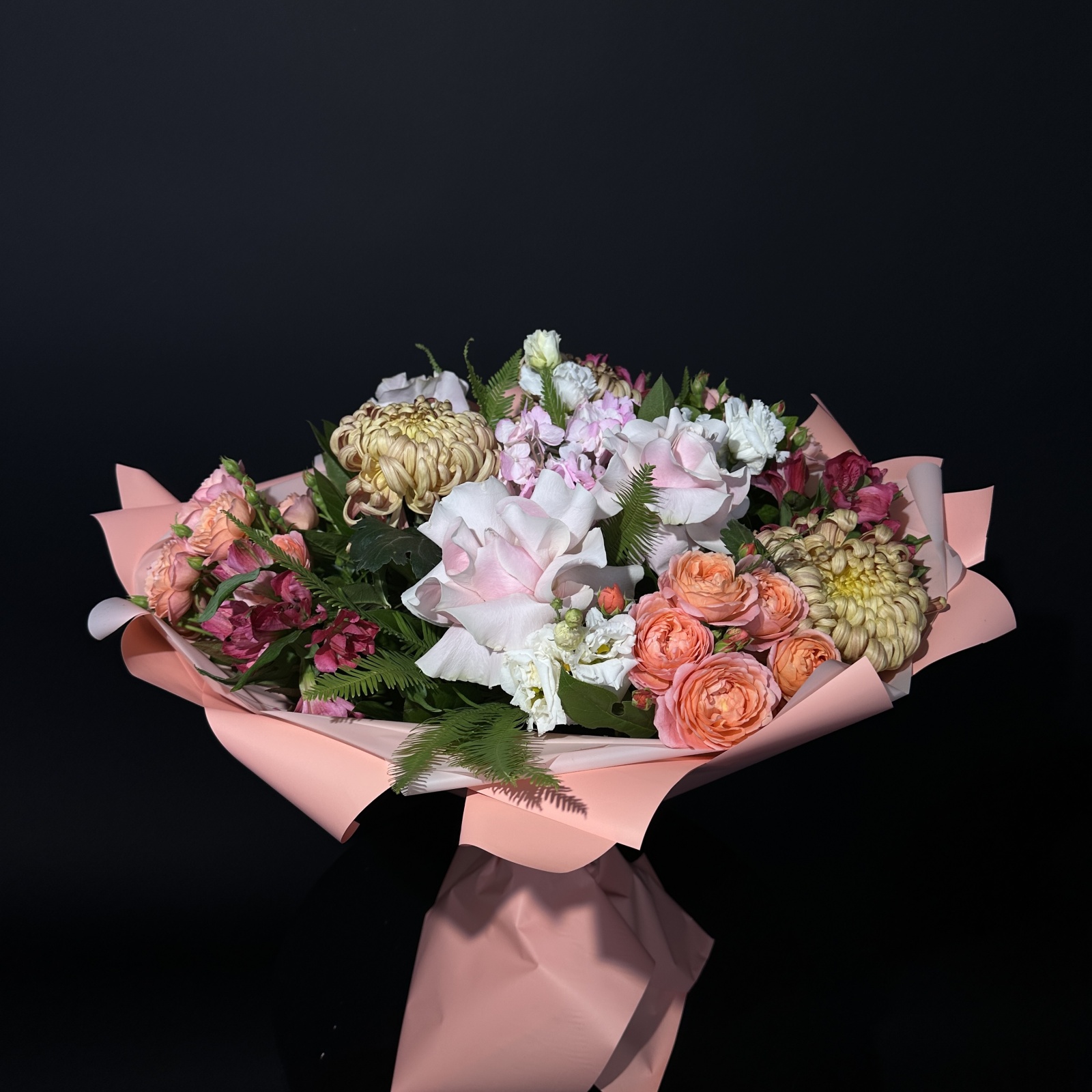 Состав: роза 3, альстромерия 3, роза кустовая 3, лизиантус 3, хризантема 2, гортензия 1 и прочее. под заказ