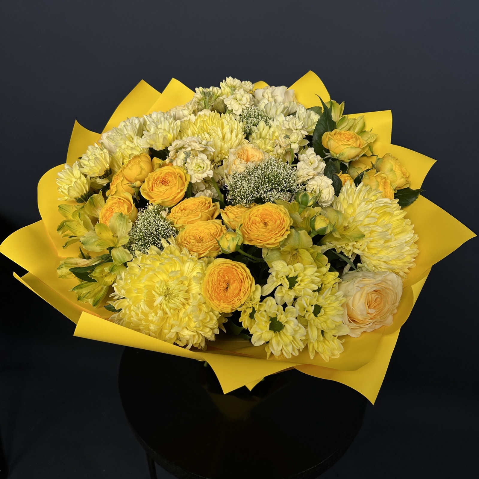 Состав: роза 5, хризантема кустовая 5, альстромерия 3, роза кустовая 3, хризантема 3, маттиола 3, рускус 0,5 и прочее. под заказ