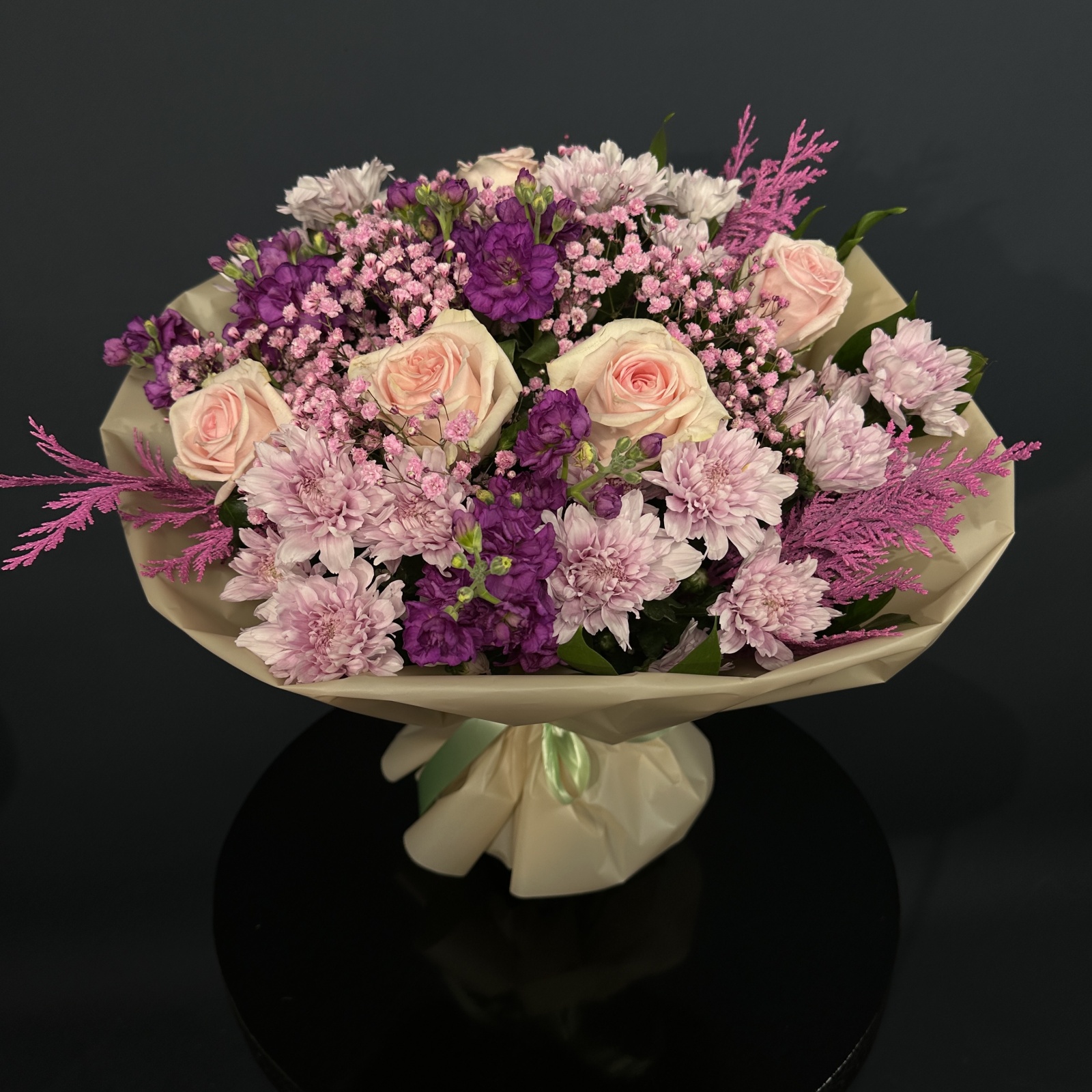 Состав: роза 5, хризантема кустовая 5, маттиола 3, рускус 0,5 и прочее. под заказ