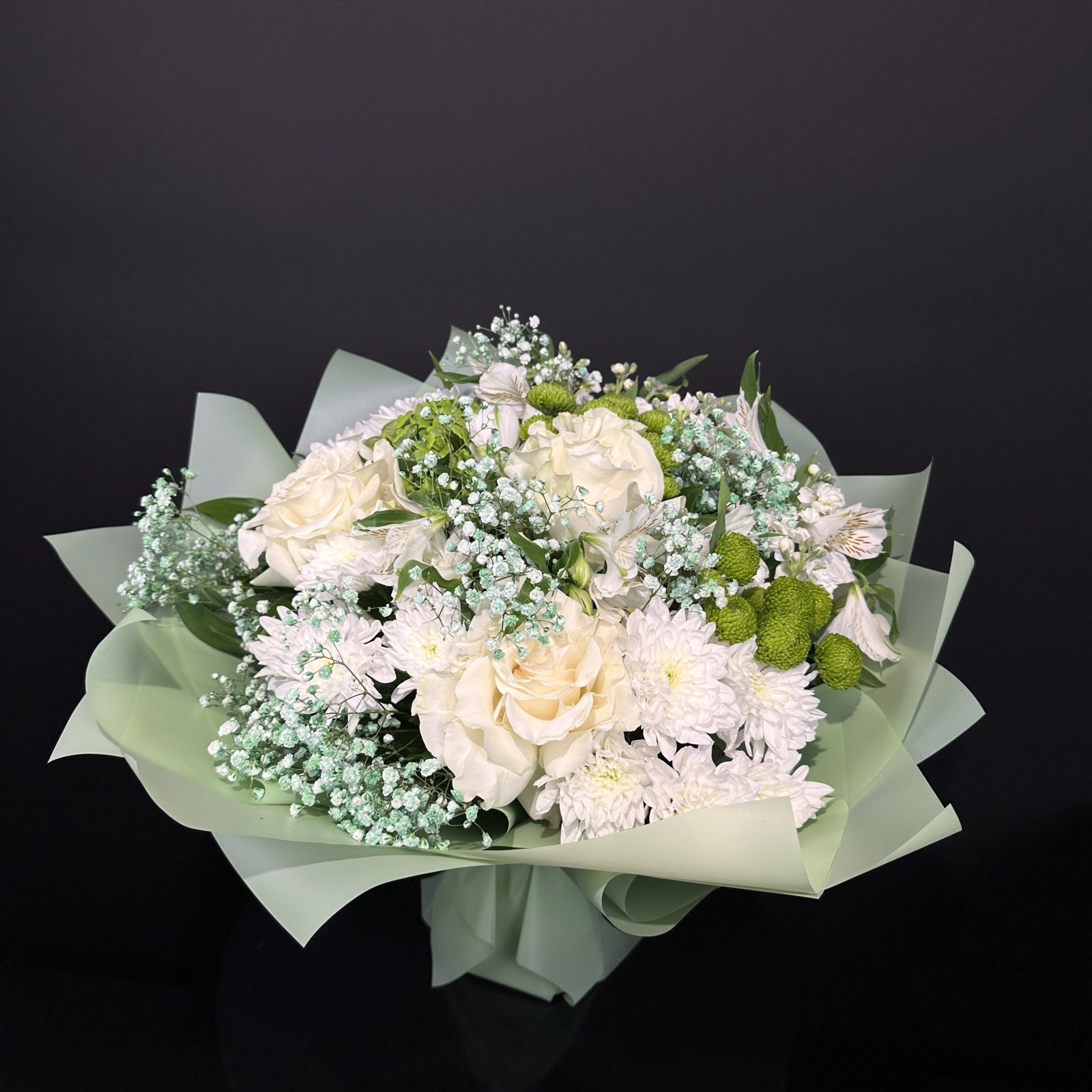 Состав: хризантема кустовая 4, роза 3, альстромерия 3, маттиола 3, гортензия 1, рускус 1 и прочее. под заказ