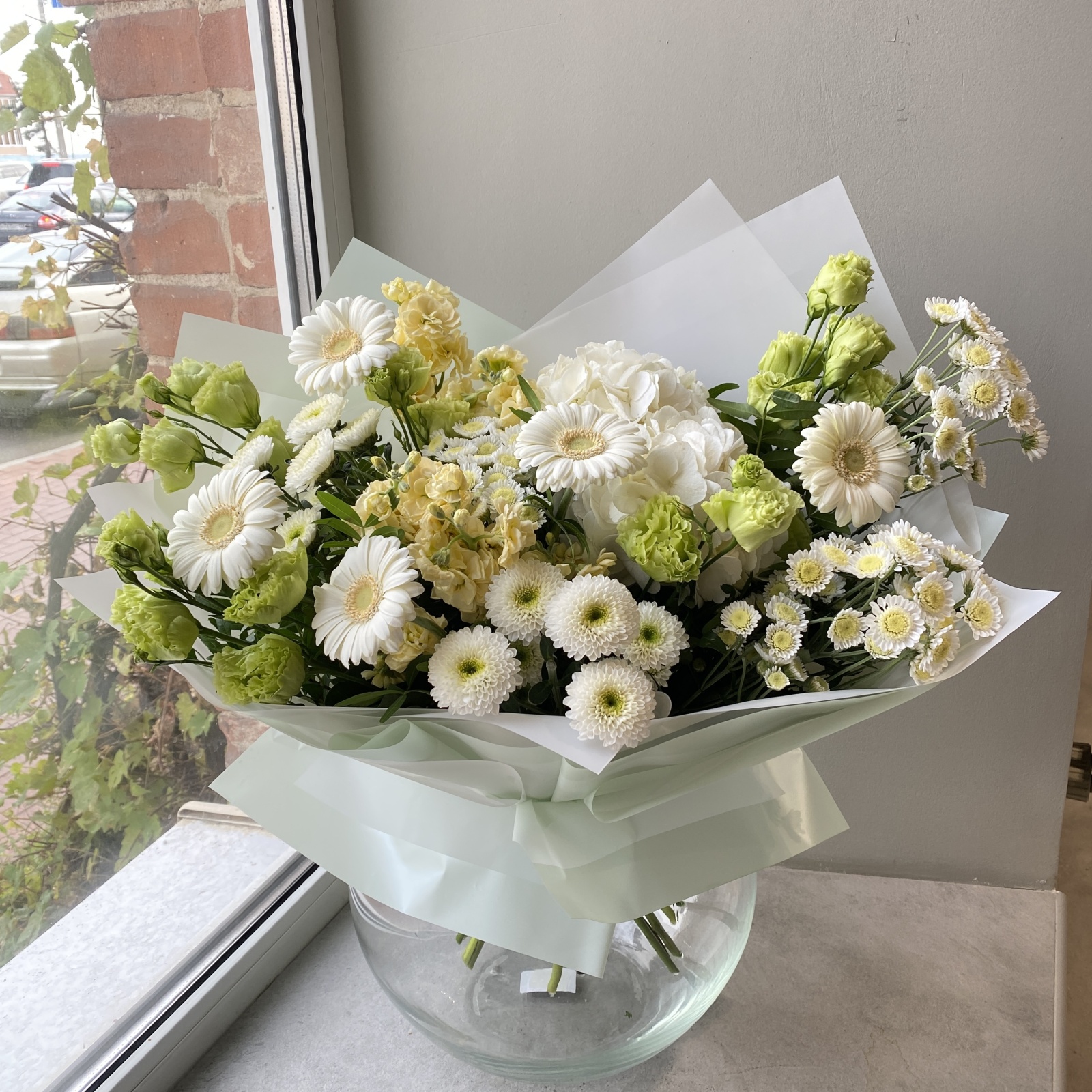 Состав: гербера 5, хризантема кустовая 4, маттиола 2, хризантема 2, альстромерия 2, гортензия 1, фисташка 0,5 и прочее.