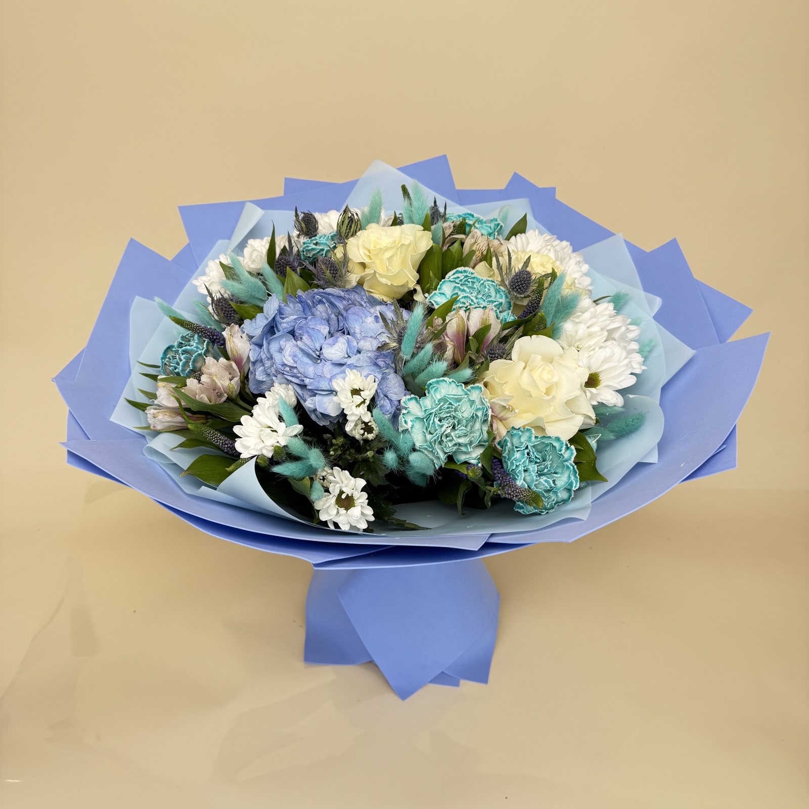 Состав: гвоздика 6, хризантема кустовая 5, эрингиум 3, роза 3, альстромерия 3, роза кустовая 1, гортензия 1, рускус 1 и прочее.