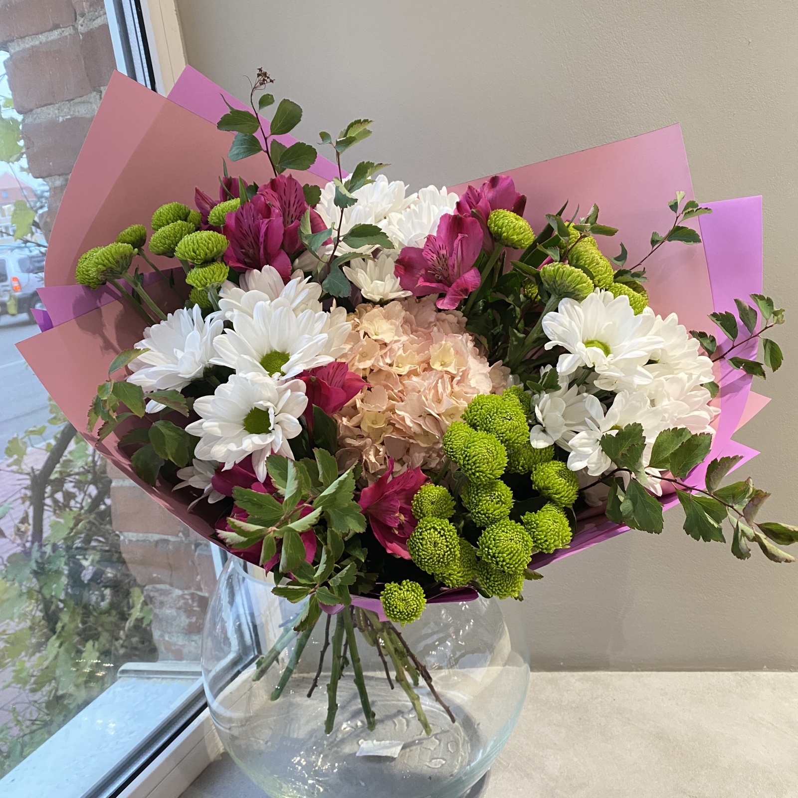 Состав: хризантема кустовая 5, альстромерия 3, гортензия 1 и прочее. под заказ