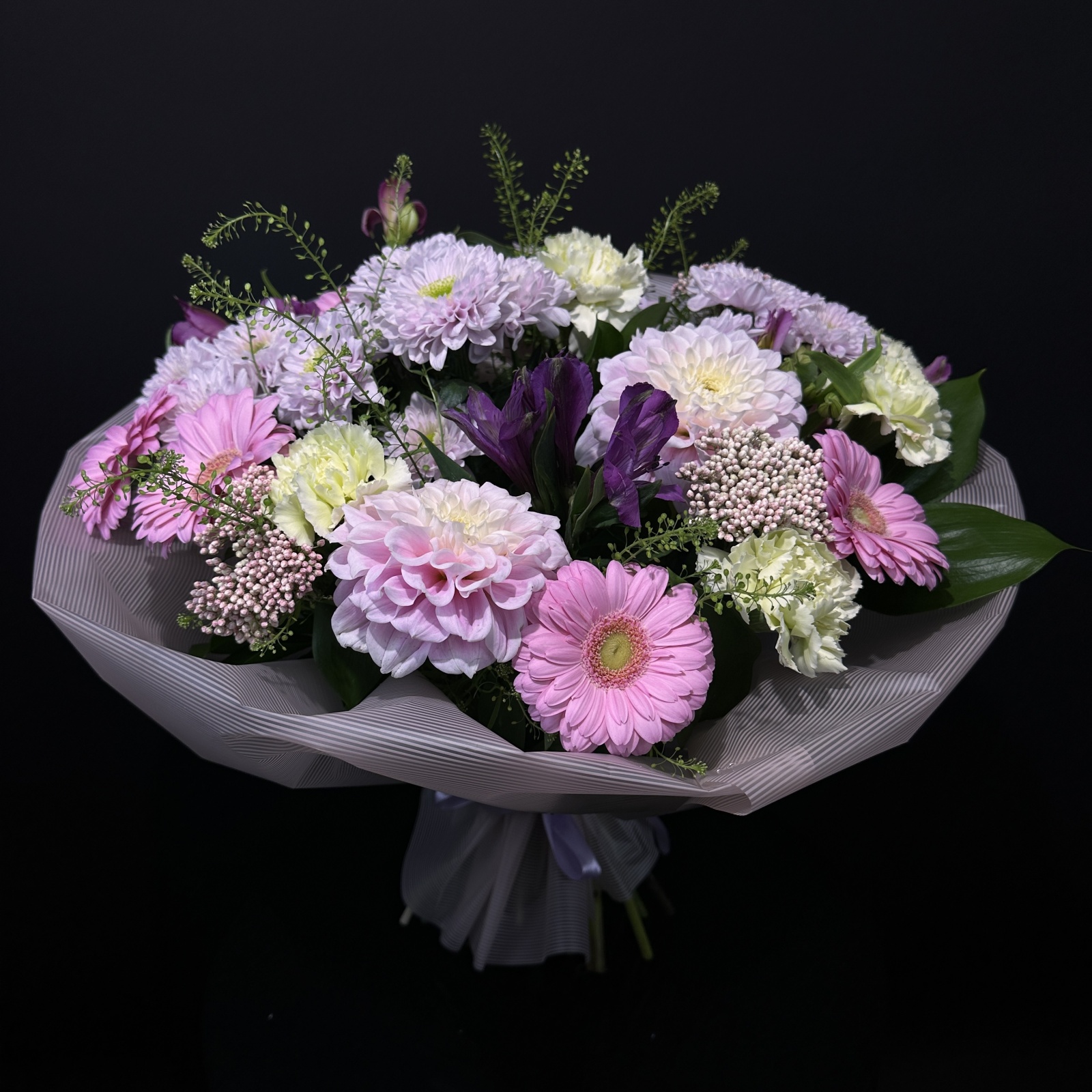 Состав: гвоздика 5, гербера 5, хризантема кустовая 3, альстромерия 3, рускус 0,5 и прочее. под заказ