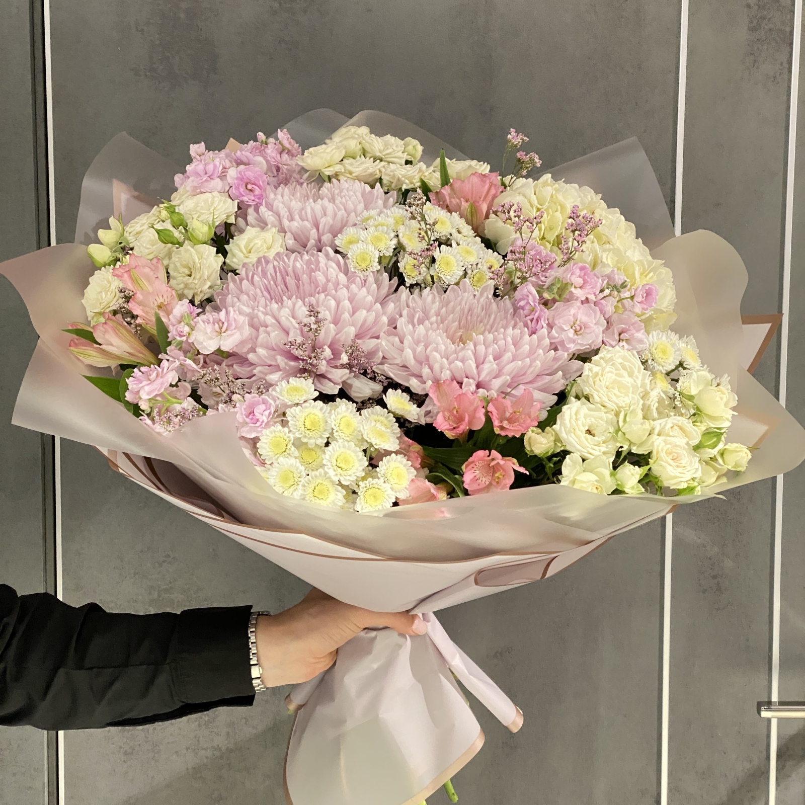 Состав: альстромерия 3, роза кустовая 3, хризантема кустовая 3, маттиола 3, хризантема 2, гортензия 1, рускус 1, лимониум 1 и прочее. под заказ