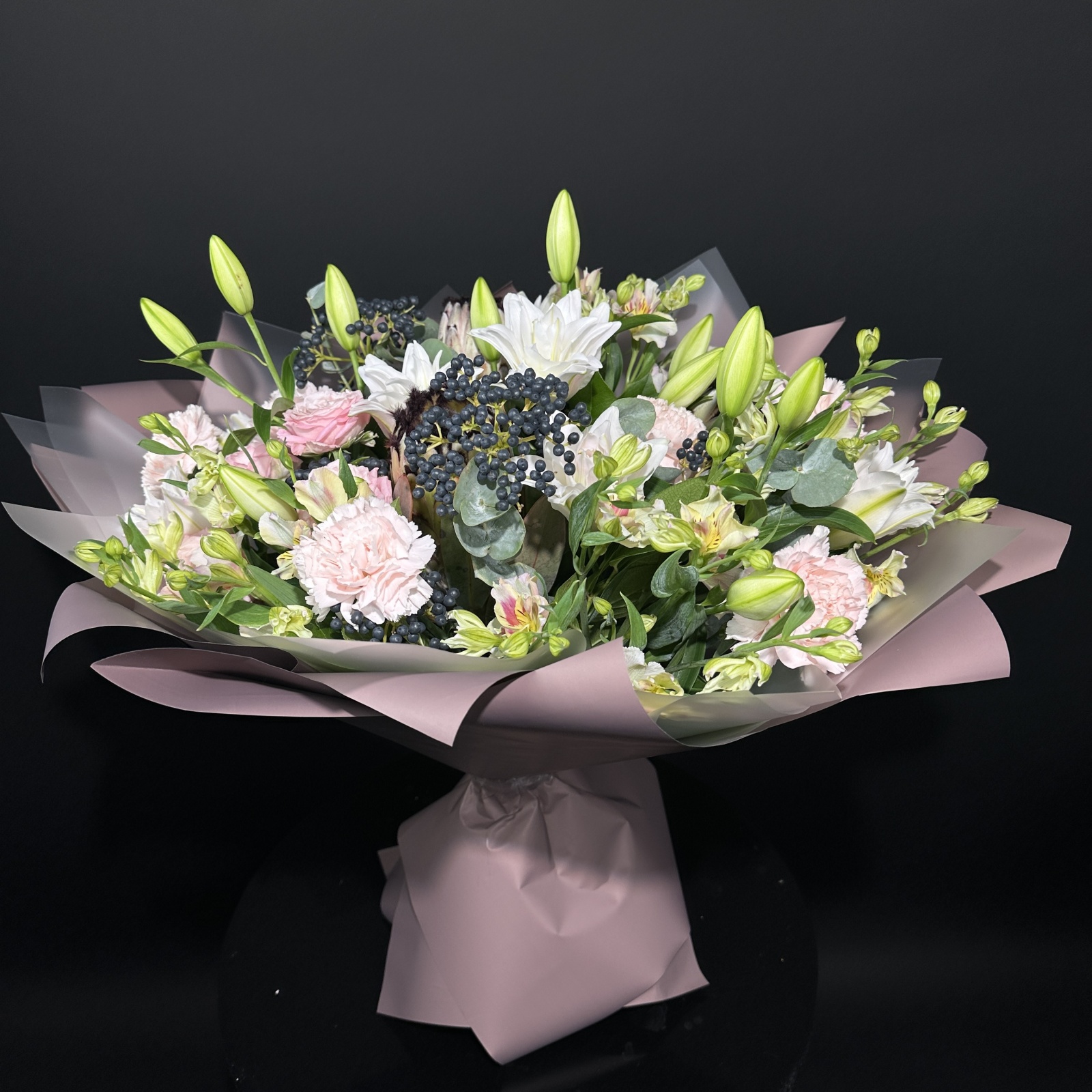 Состав: гвоздика 7, альстромерия 4, лилия 3, вибурнум 2, роза кустовая 1, эвкалипт 1, салал 0,5 и прочее. в наличии