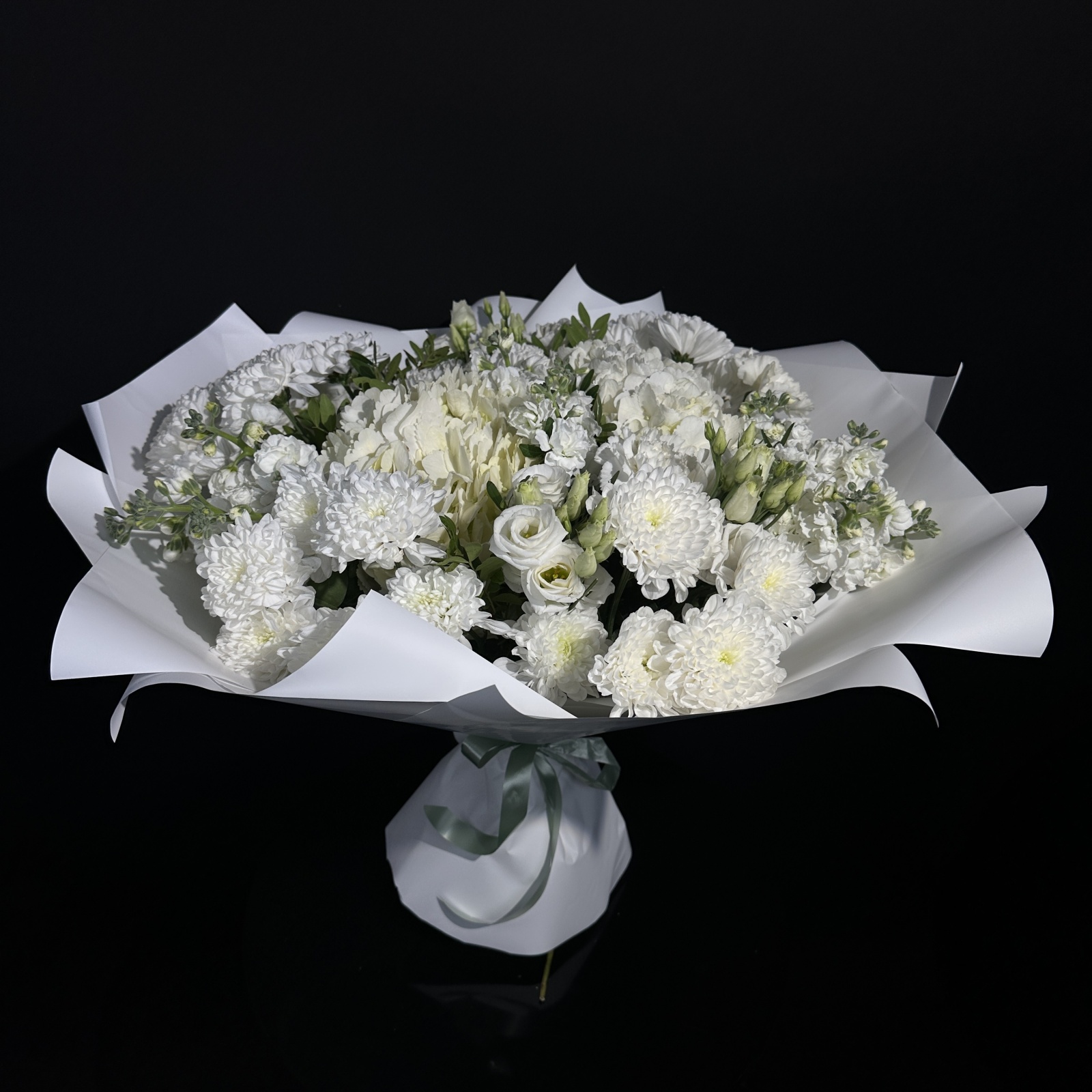 Состав: гвоздика 7, хризантема кустовая 4, маттиола 3, роза 2, гортензия 2, лизиантус 2, фисташка 1 и прочее.