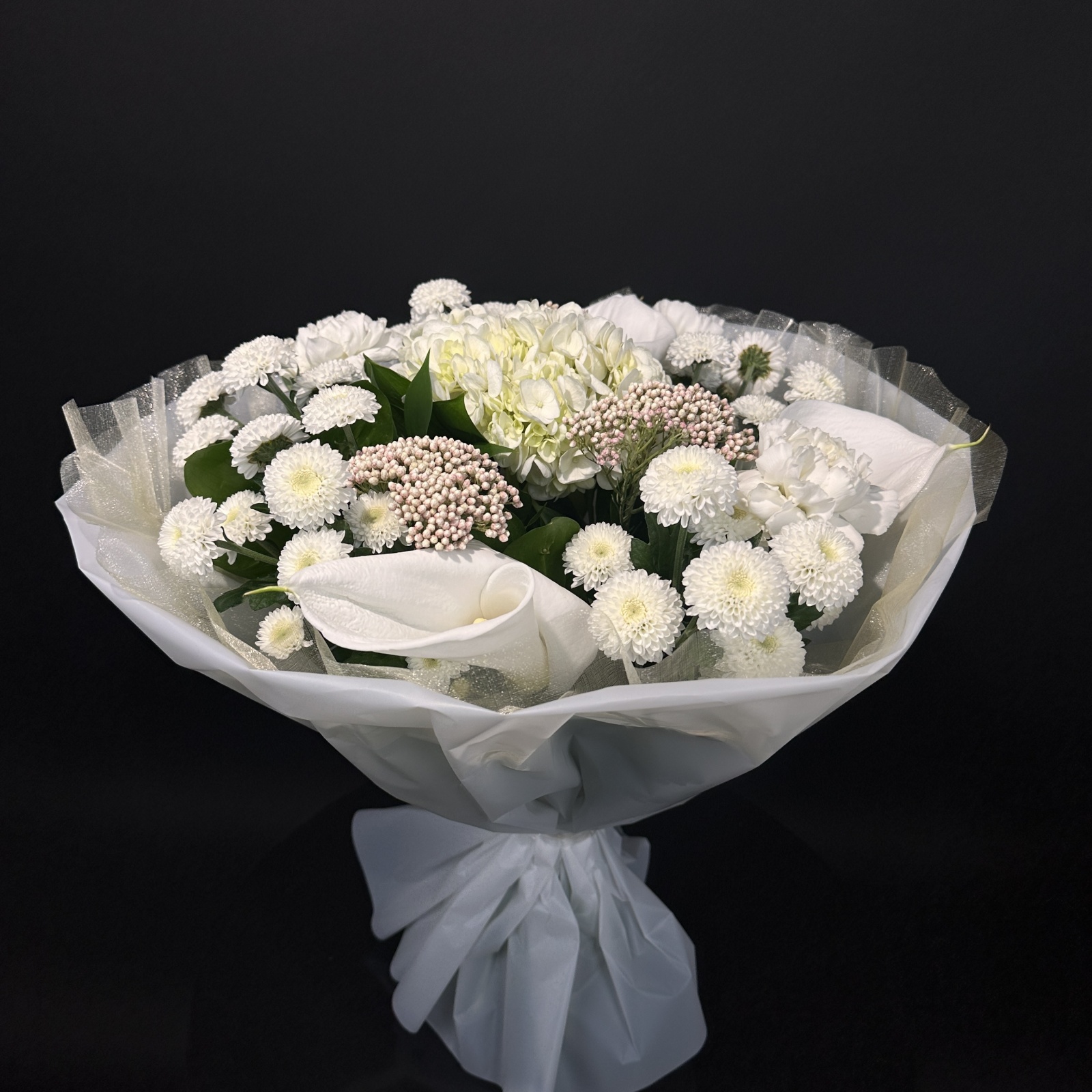 Состав: хризантема кустовая 5, гвоздика 3, гортензия 1, рускус 0,5 и прочее. под заказ