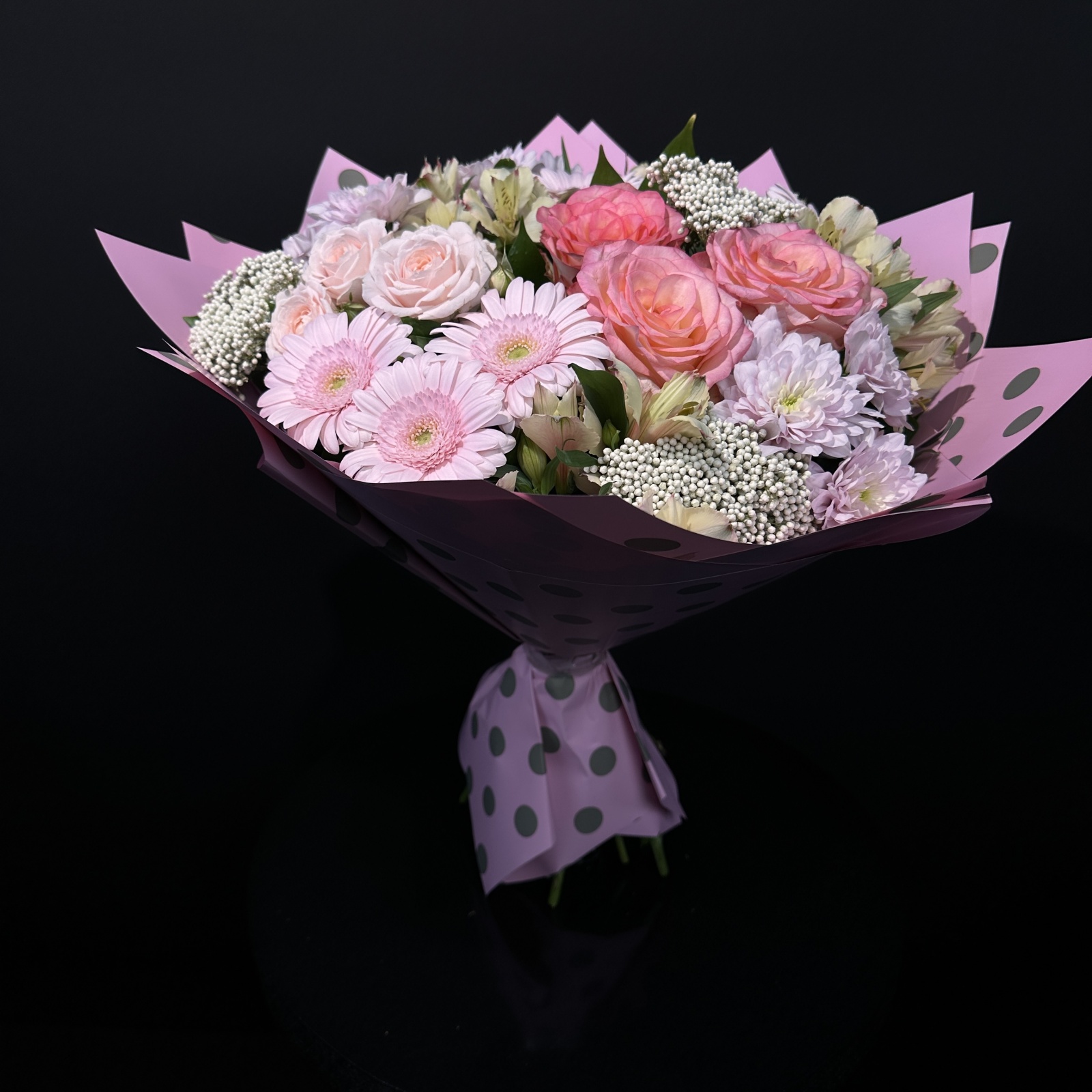 Состав: гербера 5, роза 3, альстромерия 3, хризантема кустовая 3, роза кустовая 2, рускус 0,6 и прочее. под заказ