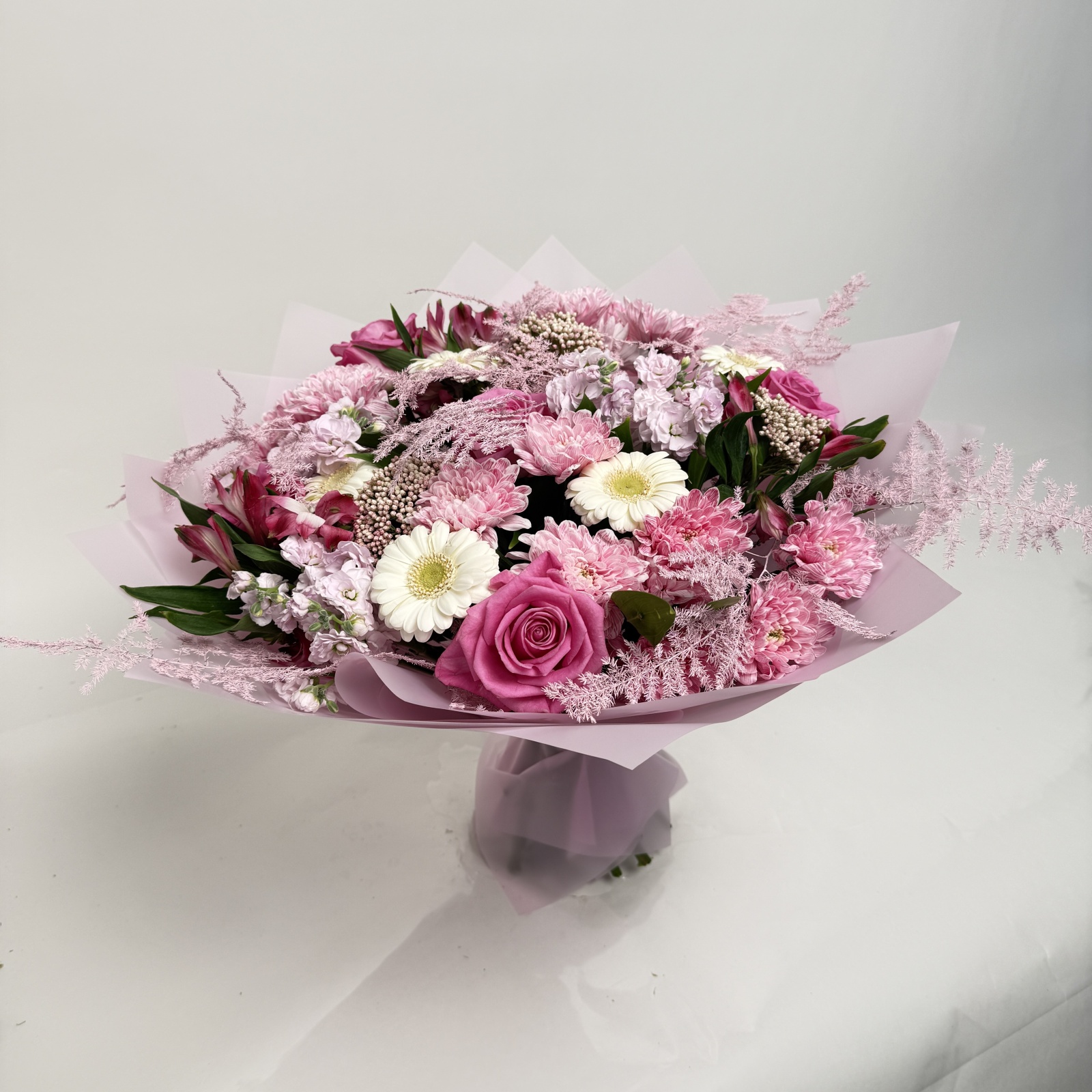 Состав: роза 5, хризантема кустовая 5, гербера 5, альстромерия 3, маттиола 3, тюльпан 1, рускус 0,5 и прочее.