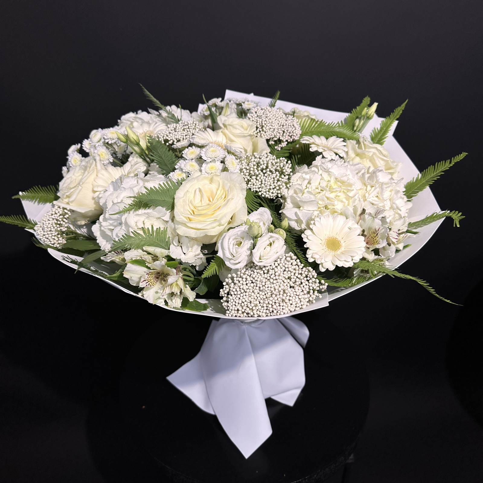 Состав: роза 5, гербера 5, гортензия 3, альстромерия 3, хризантема кустовая 3, лизиантус 2, рускус 0,5 и прочее. в наличии