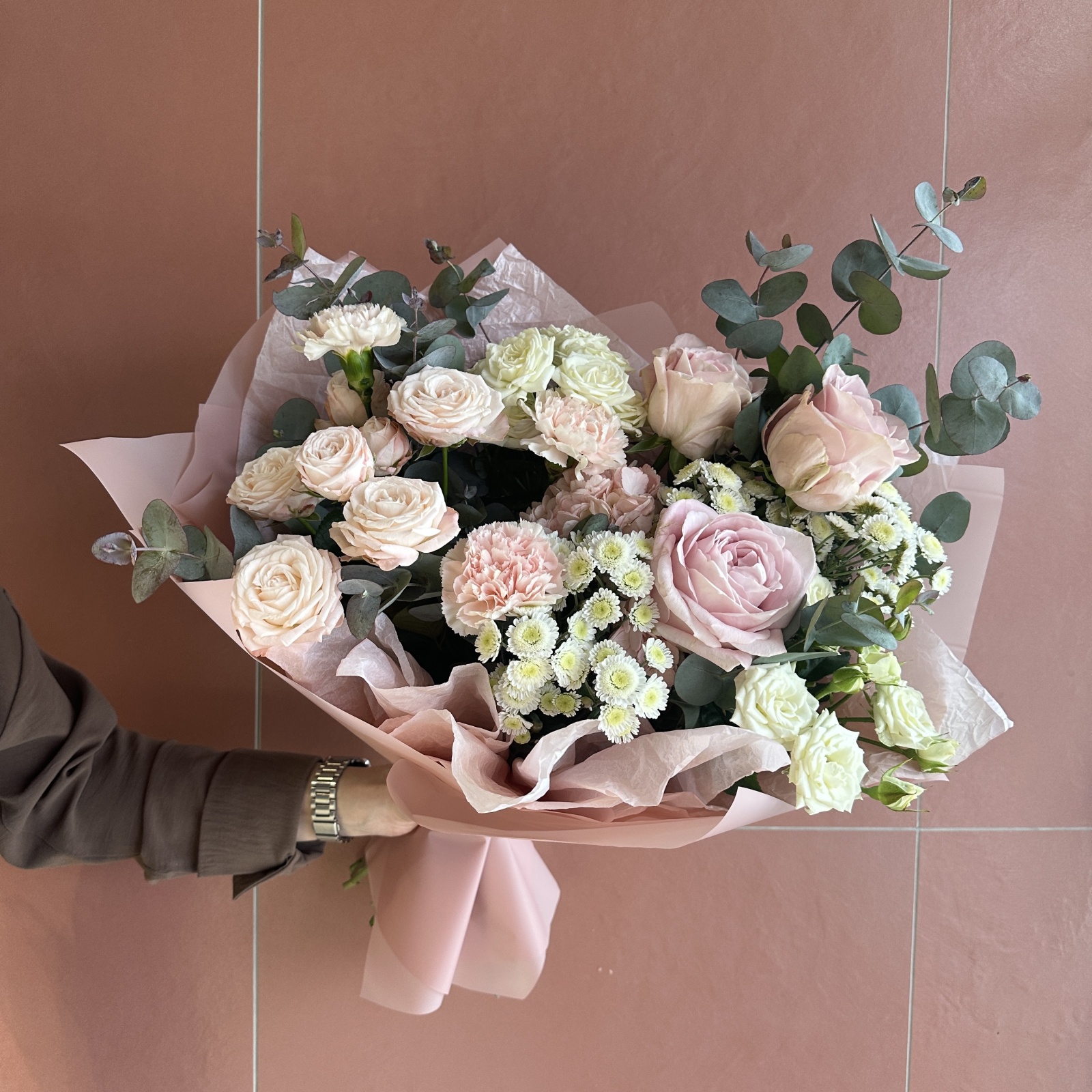 Состав: роза 3, гвоздика 3, роза кустовая 3, хризантема кустовая 3, эвкалипт 2, гортензия 1 и прочее. под заказ