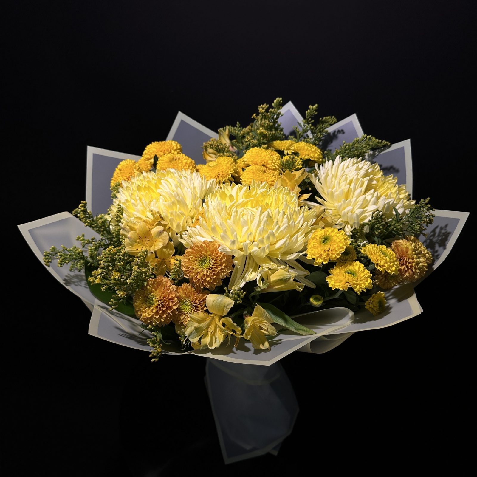 Состав: хризантема кустовая 6, альстромерия 5, солидаго 5, хризантема 3, рускус 0,5 и прочее. в наличии