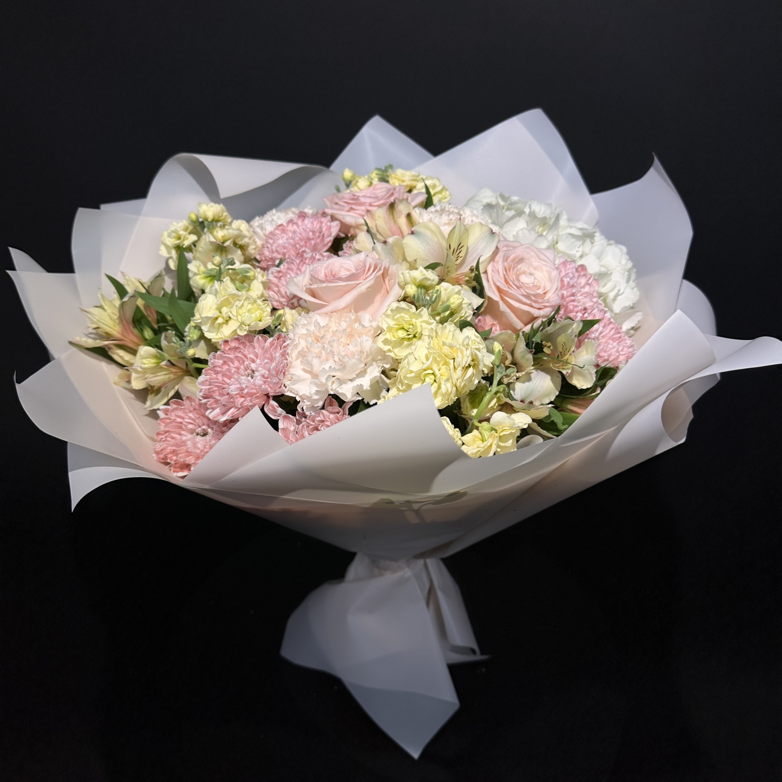 Состав: маттиола 3, роза 3, альстромерия 3, гвоздика 3, хризантема кустовая 3, гортензия 1, рускус 1 и прочее.