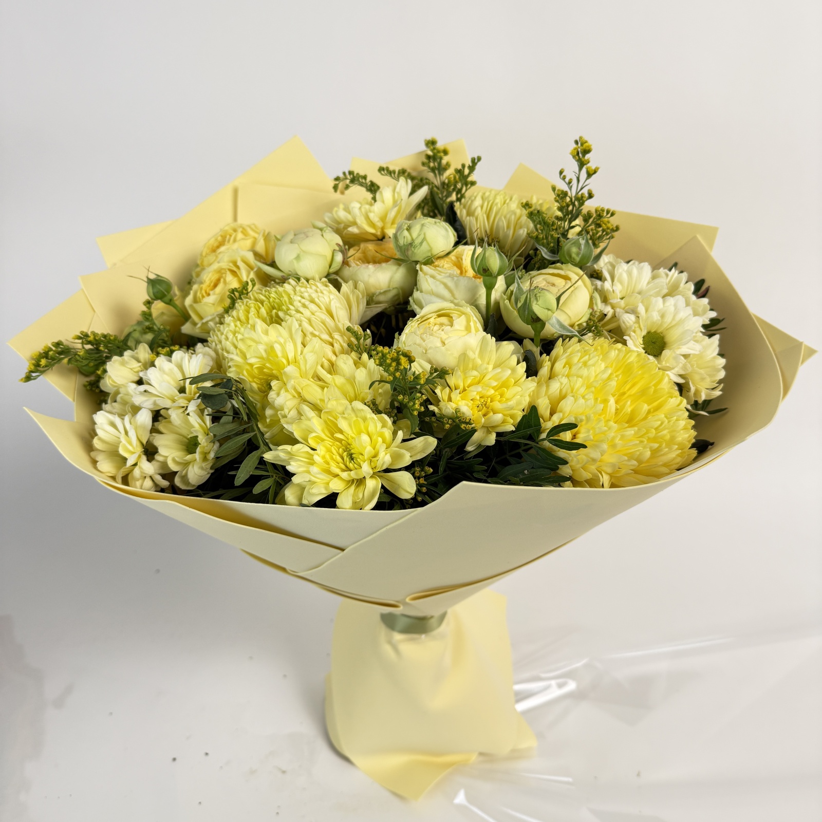 Состав: хризантема кустовая 4, солидаго 4, хризантема 3, роза кустовая 2, ранункулюс 1, фисташка 1 и прочее.