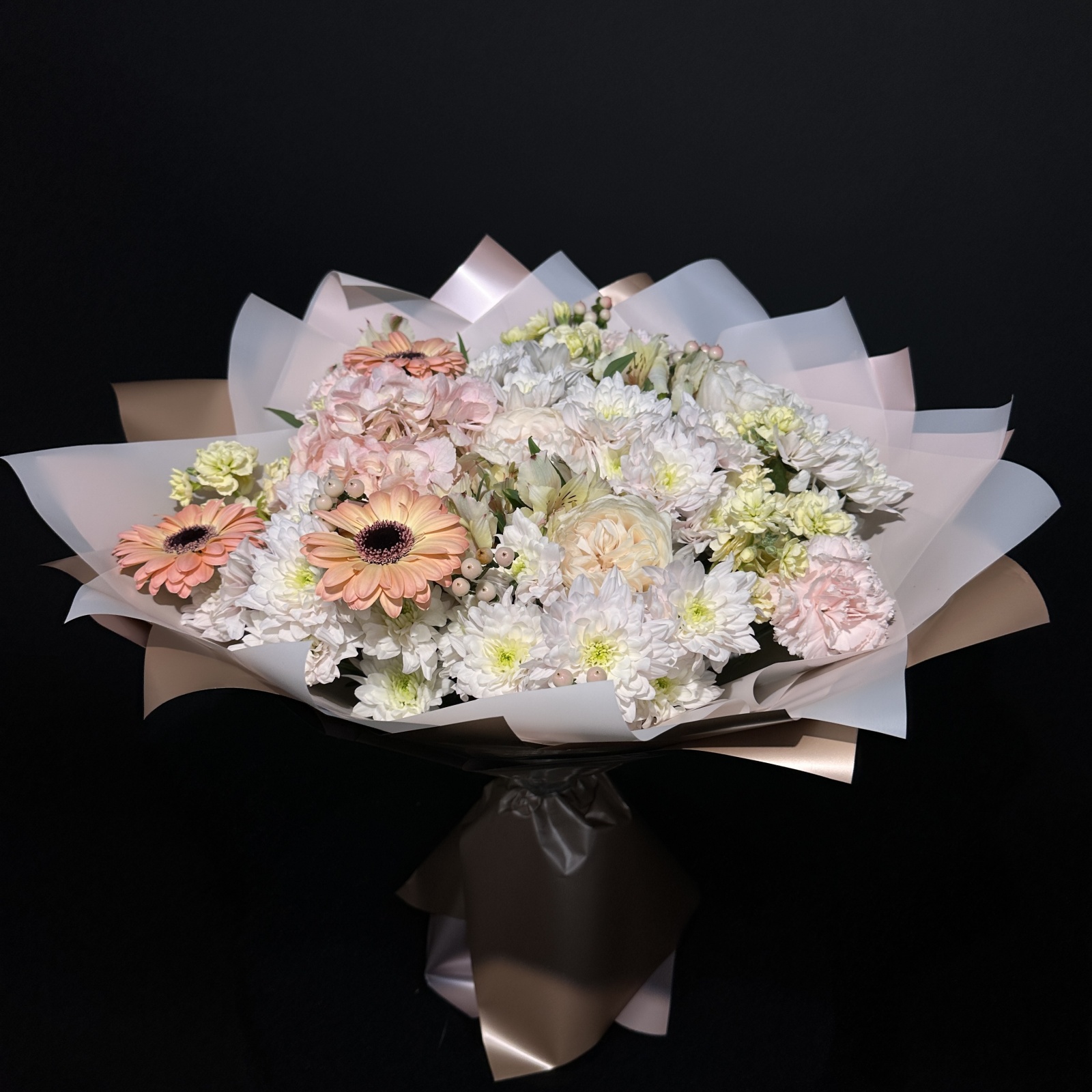 Состав: хризантема кустовая 5, гербера 4, роза 3, альстромерия 3, гвоздика 3, маттиола 3, гортензия 1, гиперикум 1 и прочее. под заказ
