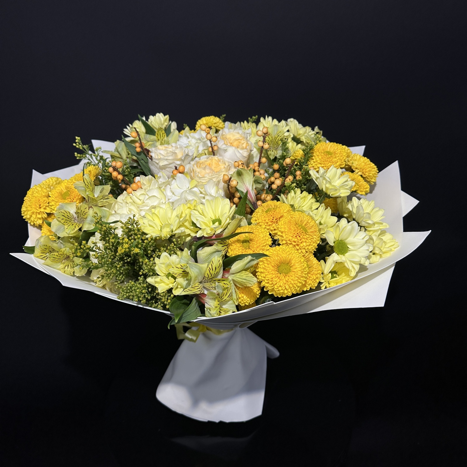 Состав: хризантема кустовая 8, альстромерия 5, роза 4, солидаго 4, гортензия 2, фисташка 0,5 и прочее. под заказ