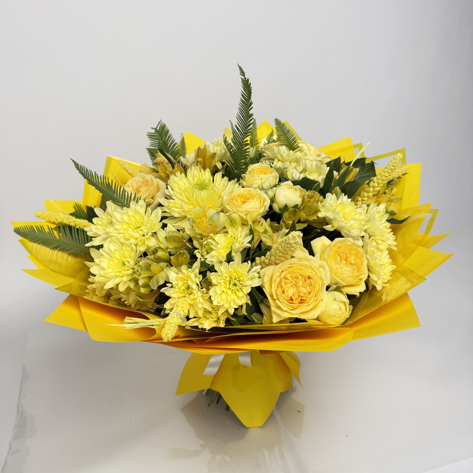 Состав: альстромерия 6, хризантема кустовая 5, роза кустовая 4, роза 2, хризантема 1, салал 0,5 и прочее.