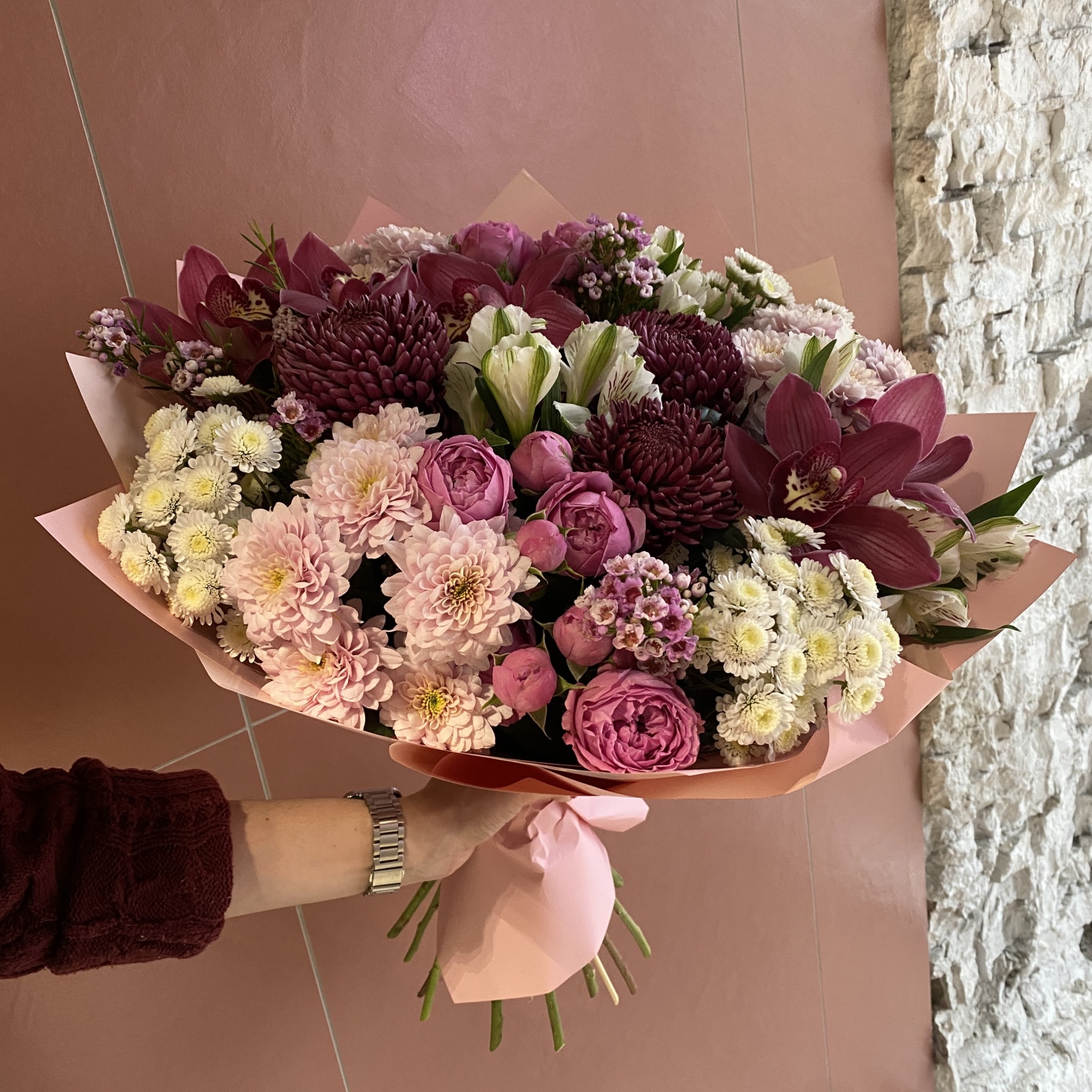 Состав: хризантема кустовая 6, хризантема 3, альстромерия 3, хамелациум 3, роза кустовая 2, ветка цимбидиум 0,5, рускус 0,4 и прочее.
