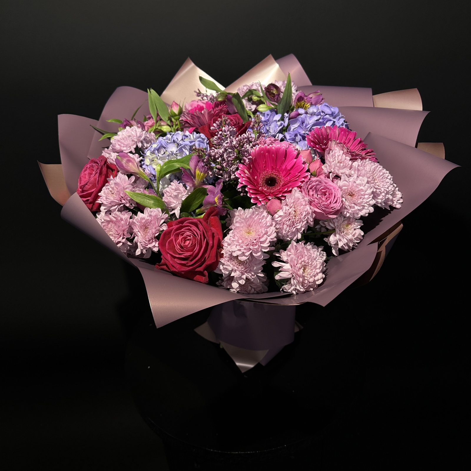 Состав: хризантема кустовая 5, гербера 3, роза 3, альстромерия 3, роза кустовая 2, сирень 2, гортензия 2, рускус 0,5 и прочее. под заказ