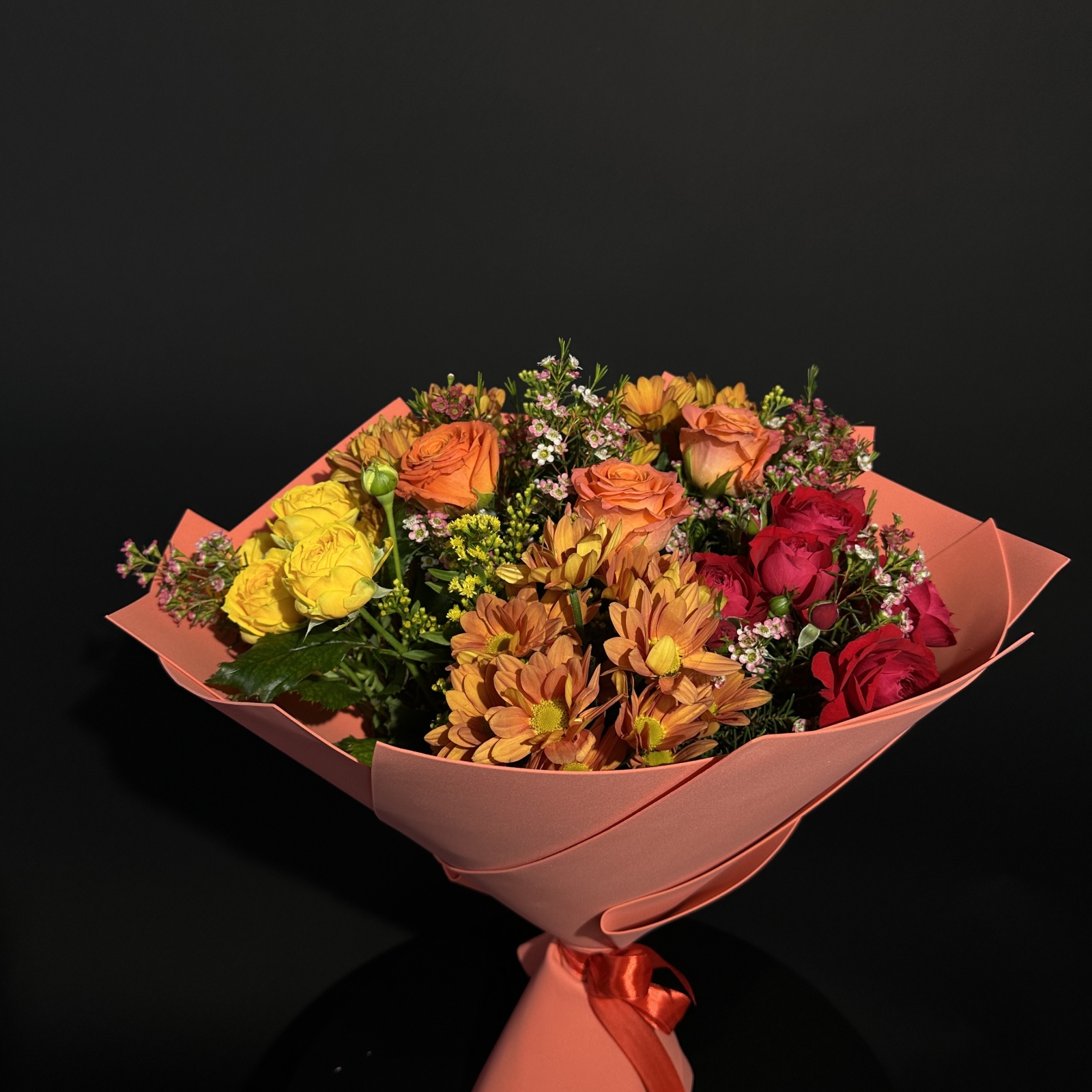 Состав: роза 4, хризантема кустовая 3, солидаго 3, роза кустовая 2, анемон 1, гладиолус 1, хамелациум 1 и прочее. под заказ