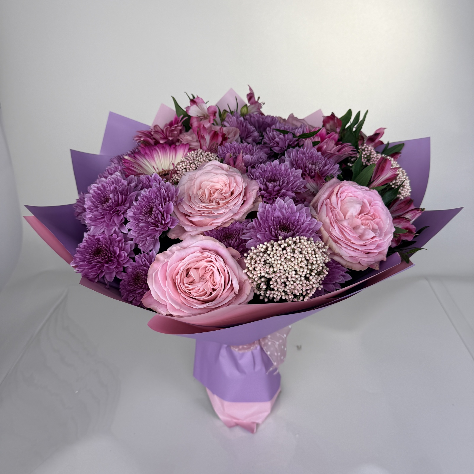 Состав: альстромерия 5, хризантема кустовая 5, роза 4, гербера 3, солидаго 1, фисташка 1 и прочее. в наличии