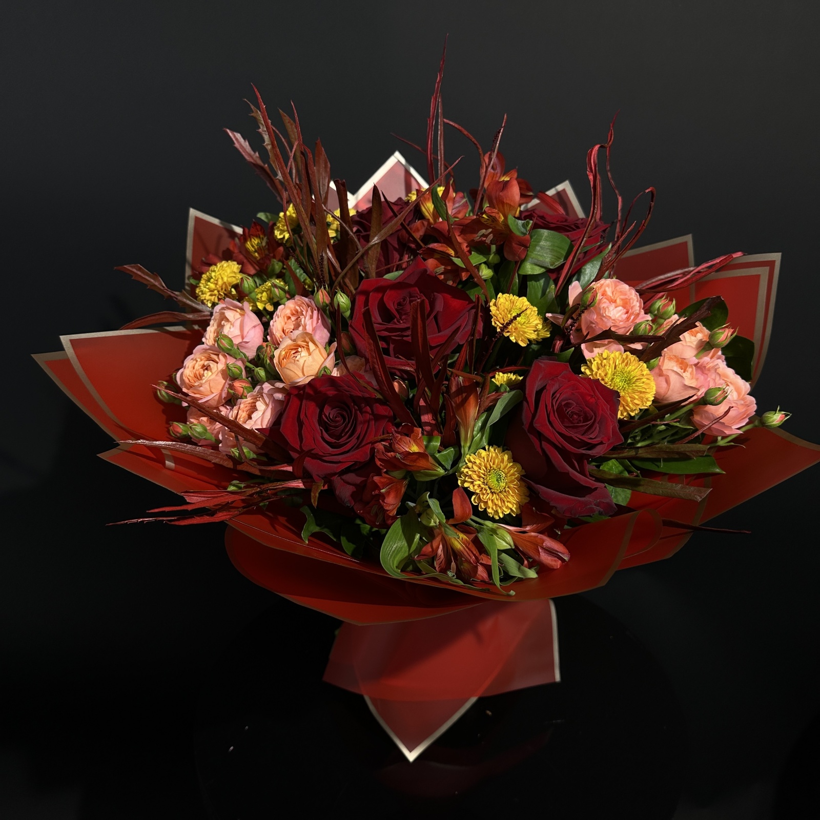 Состав: роза 5, альстромерия 3, хризантема кустовая 3, роза кустовая 2, рускус 0,8 и прочее.