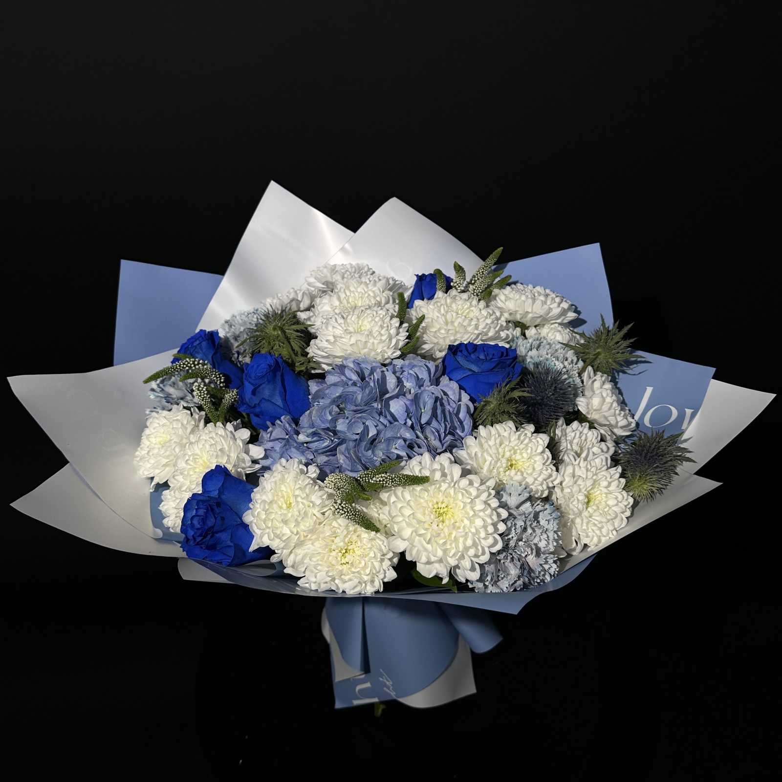 Состав: хризантема кустовая 7, гвоздика 6, роза 5, эрингиум 2, гортензия 1, рускус 0,5 и прочее.