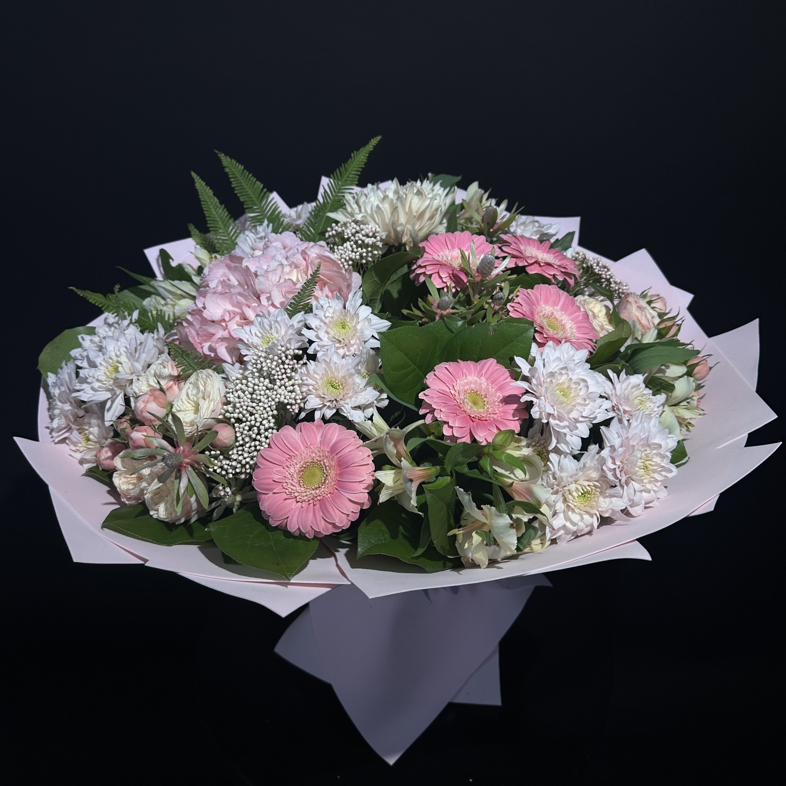 Состав: гербера 10, хризантема кустовая 5, альстромерия 4, леукадендрон 3, роза кустовая 2, хризантема 1, гортензия 1, салал 0,7 и прочее. в наличии