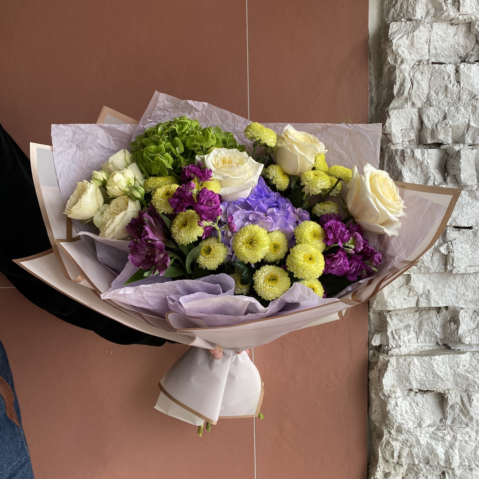Состав: хризантема кустовая 4, роза 3, гортензия 2, маттиола 2, альстромерия 1, роза кустовая 1, рускус 0,3 и прочее. под заказ