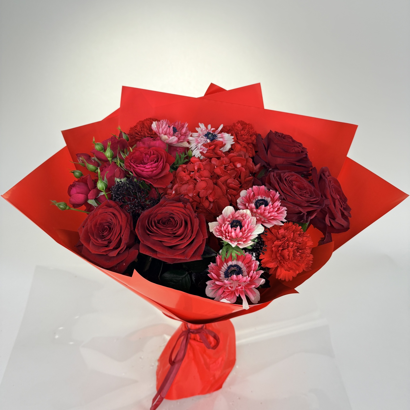 Состав: роза 5, анемон 5, гвоздика 3, роза кустовая 1, гортензия 1 и прочее. в наличии