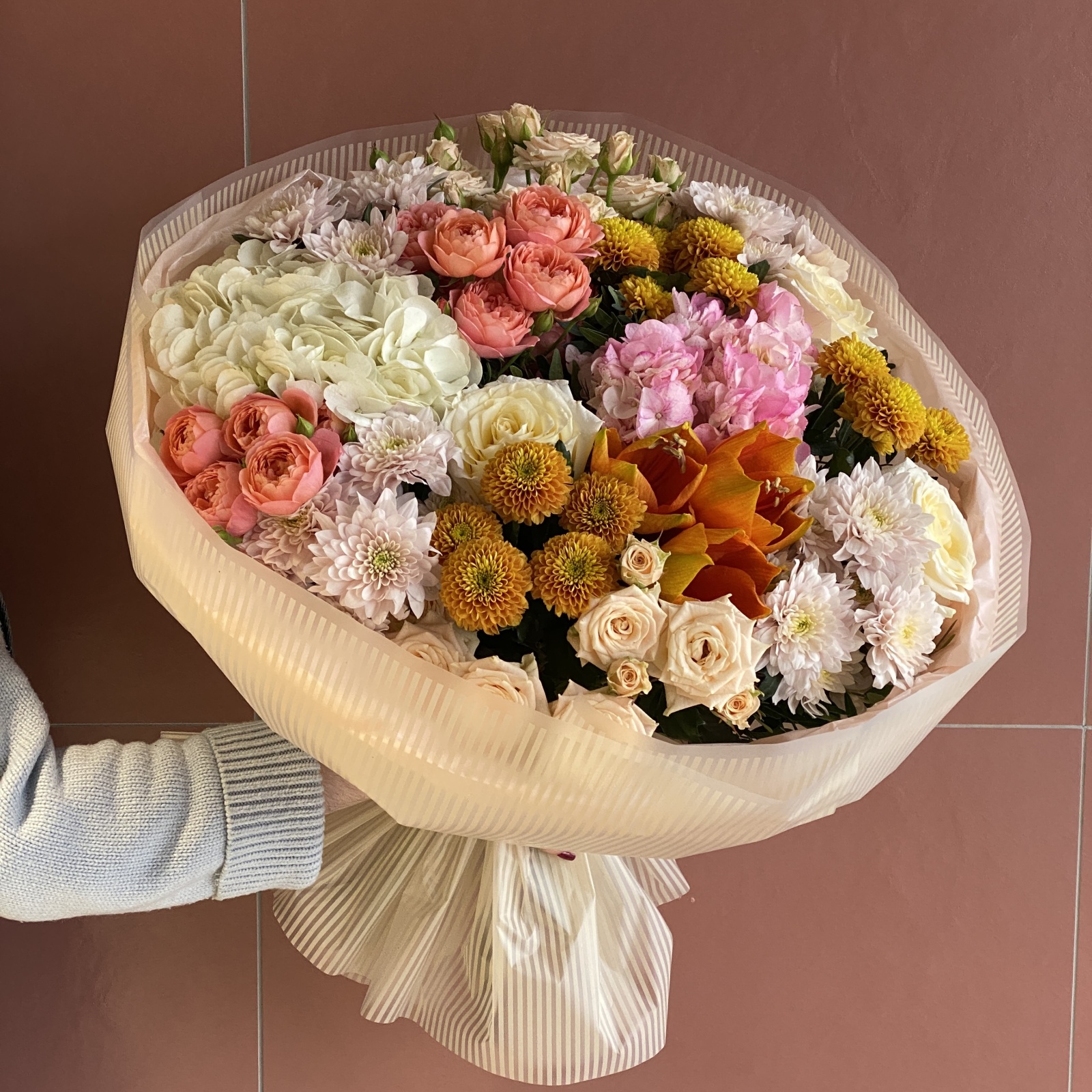 Состав: хризантема кустовая 7, роза кустовая 4, роза 3, гортензия 2, гиппеаструм 1, фисташка 0,7 и прочее.