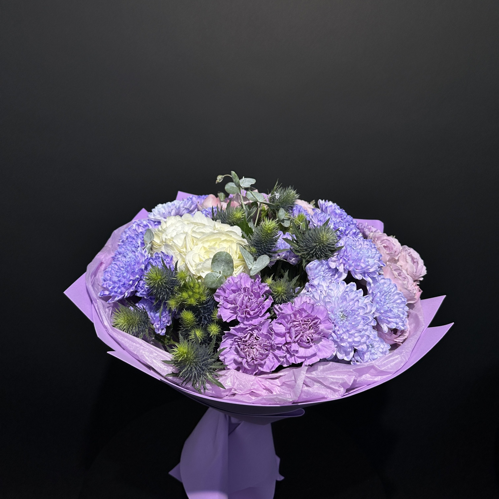 Состав: гвоздика 4, хризантема кустовая 4, роза кустовая 2, эвкалипт 2, эрингиум 2, гортензия 1 и прочее. под заказ