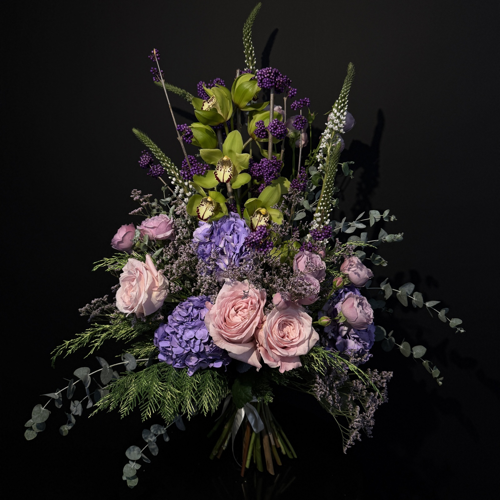 Состав: лизимахия 5, лимониум 3, роза 3, роза кустовая 3, гортензия 3, ветка цимбидиум 0,7 и прочее.