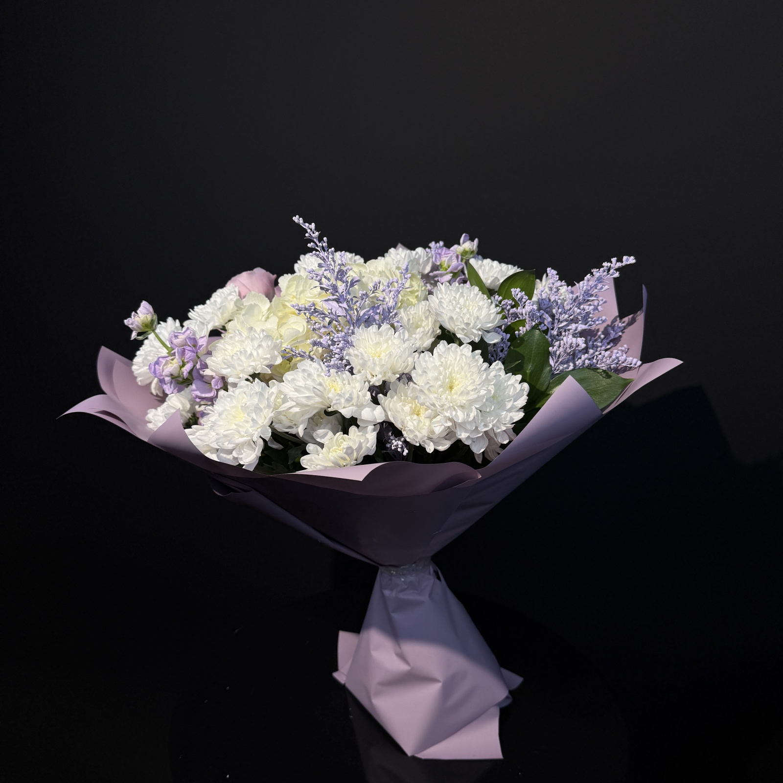 Состав: хризантема кустовая 5, солидаго 3, маттиола 2, роза кустовая 1, гортензия 1, рускус 1 и прочее. под заказ