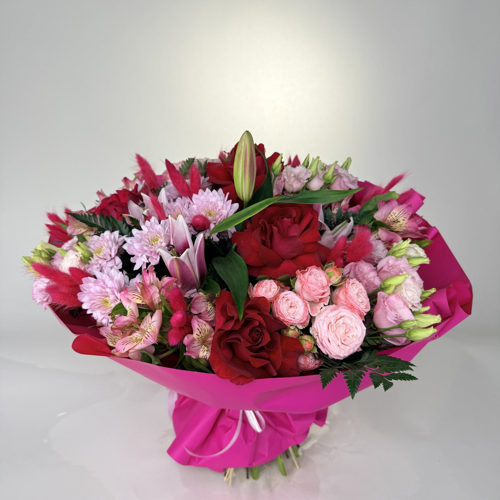 Состав: роза 5, альстромерия 4, хризантема кустовая 4, лизиантус 3, лилия 1, роза кустовая 1, папоротник 0,9 и прочее. под заказ