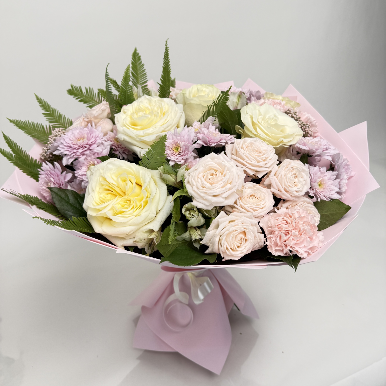 Состав: роза 6, гвоздика 6, хризантема кустовая 5, роза кустовая 3, альстромерия 3, салал 0,5 и прочее. под заказ