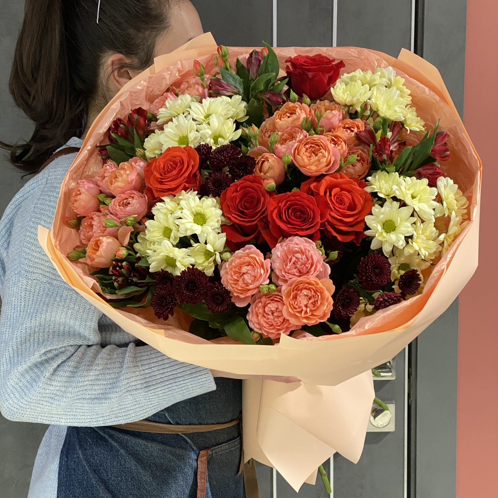 Состав: роза 5, альстромерия 4, роза кустовая 4, хризантема кустовая 4, хризантема 3, рускус 1 и прочее.
